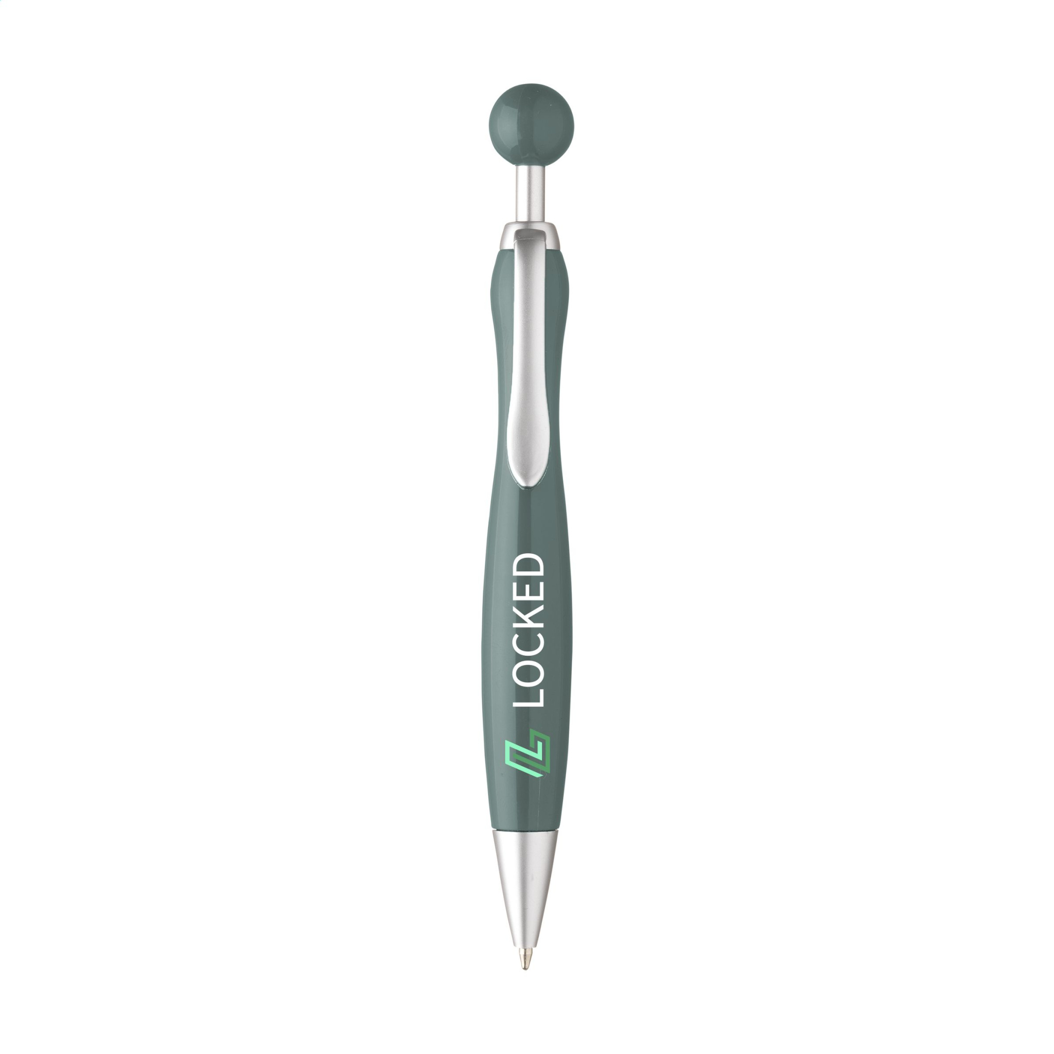 Sinisellä musteella varustettu kuulakärkikynä pallomaisella painonapilla.