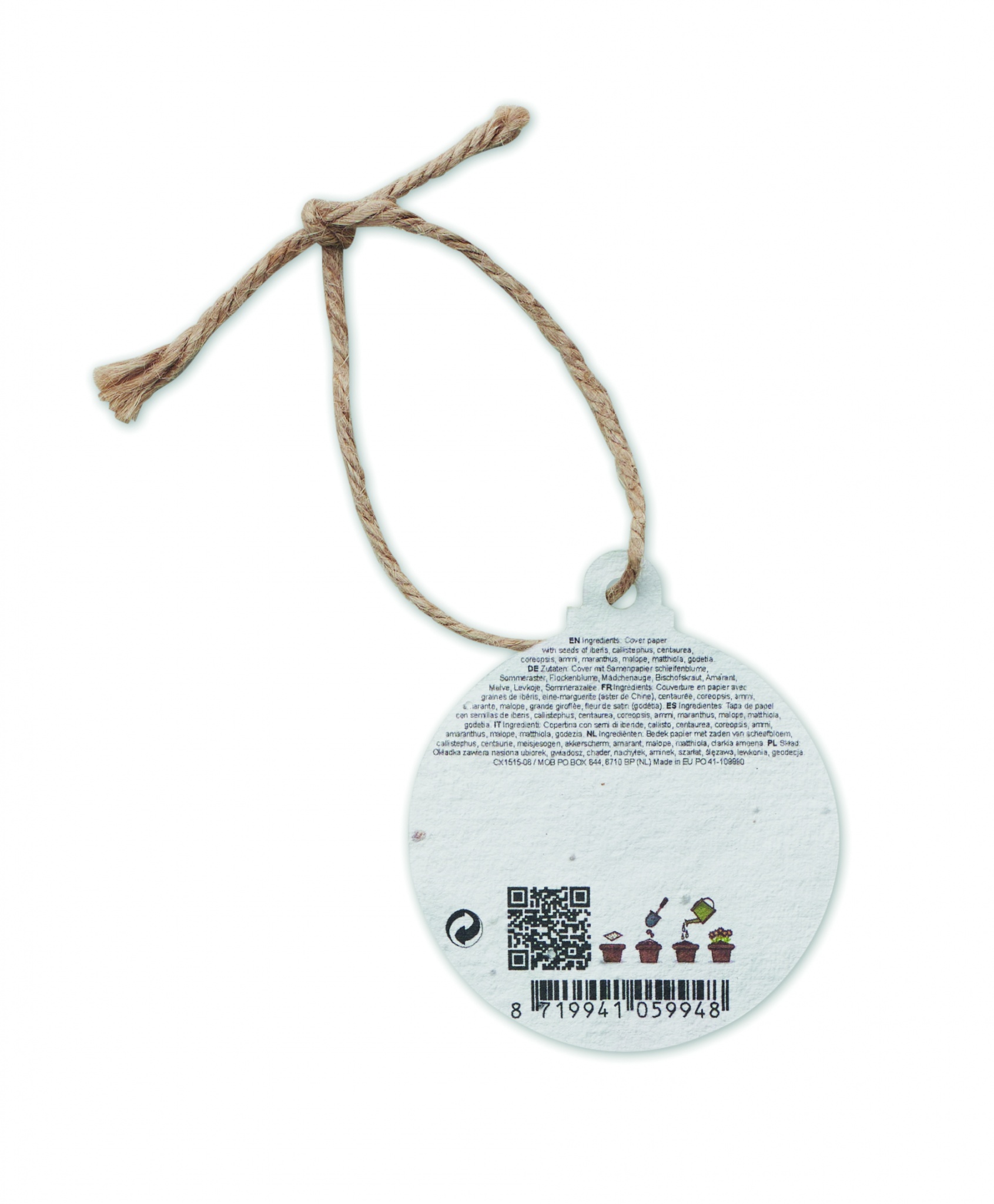 Pehmeä villikukkasekoitus siemenpaperi joulukoristeena juuttikäydellä. Istuta paperi käytön jälkeen ja kasvata oma villikukkaniittysi. Valmistusmaa EU.