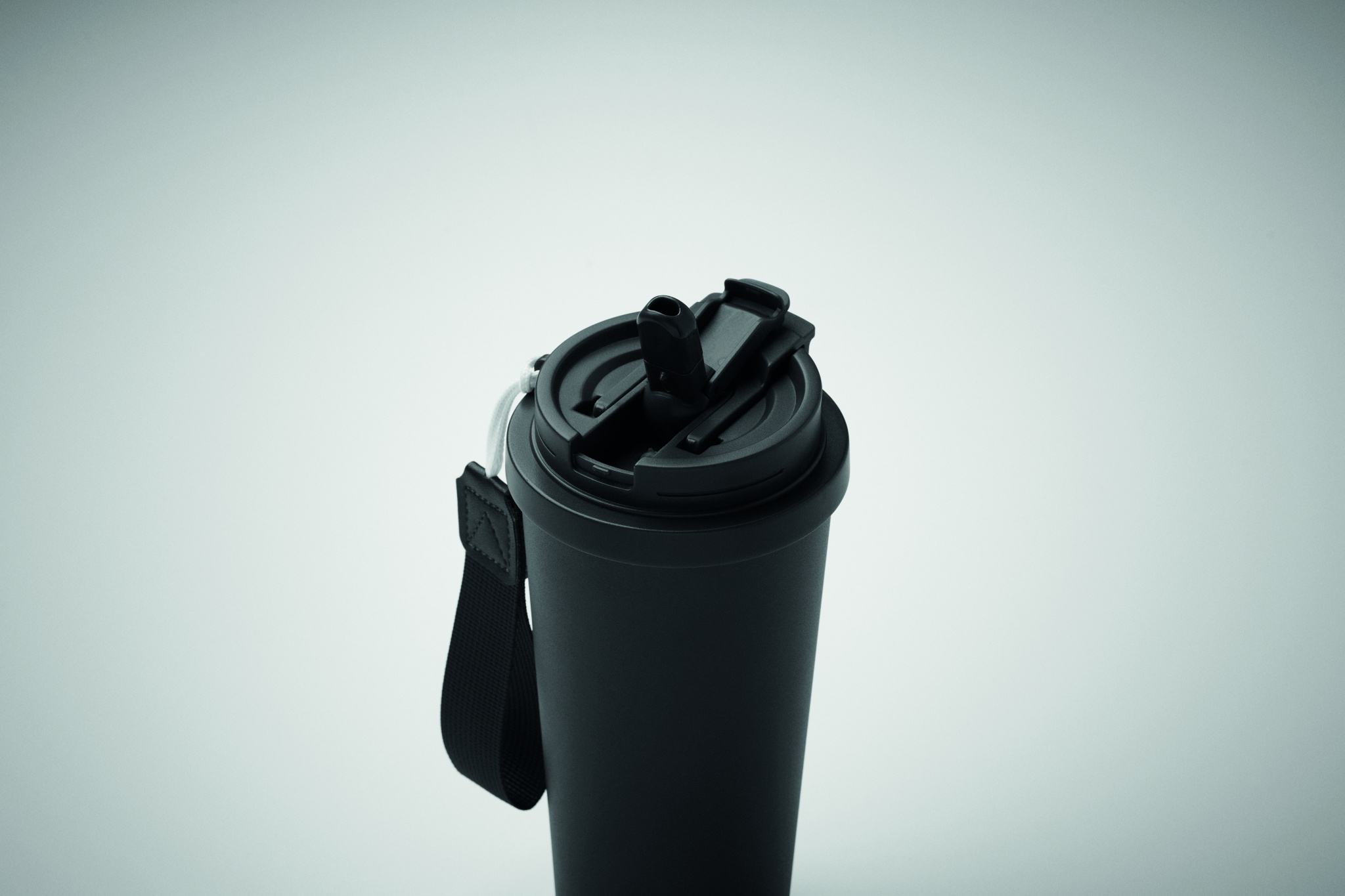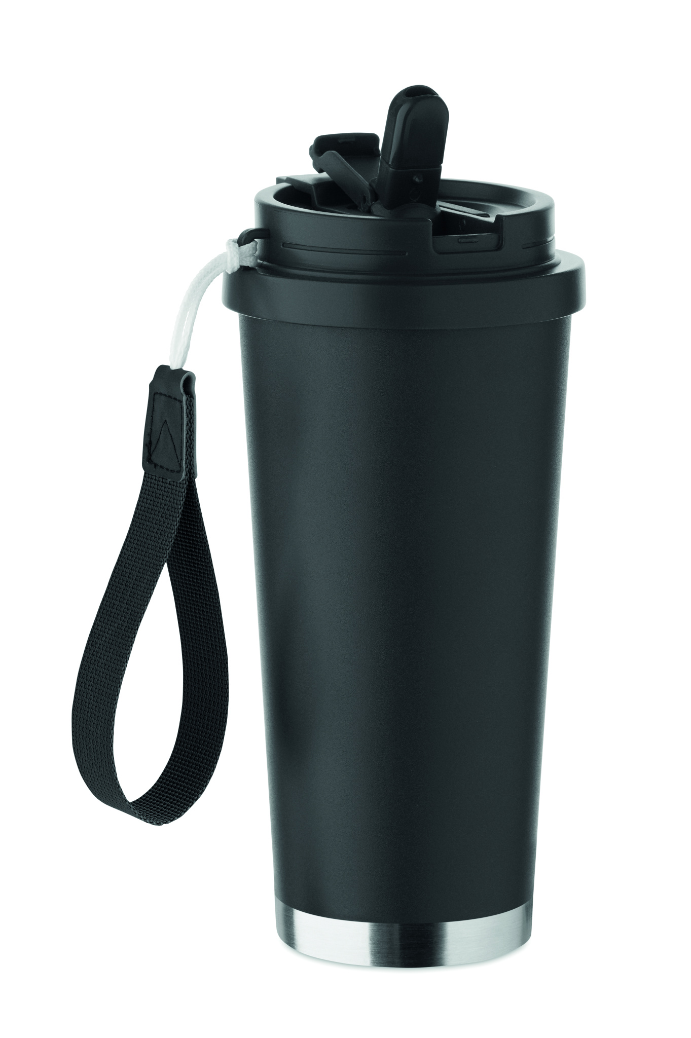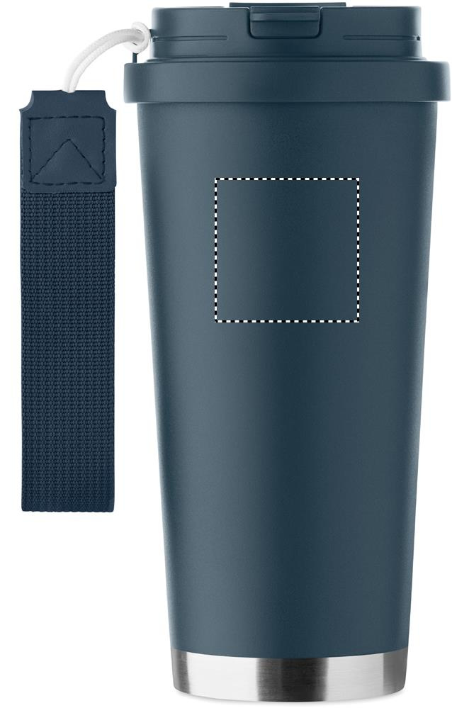 Kaksinkertainen kierrätetystä ruostumattomasta teräksestä (90 % kierrätettyä ruostumatonta terästä ja 10 % ruostumatonta terästä) valmistettu muki, jossa PP-kansi (2-in-1 juoma- ja pillikansi) ja RPET-kantohihna. Vuotamaton. Tilavuus: 500 ml.