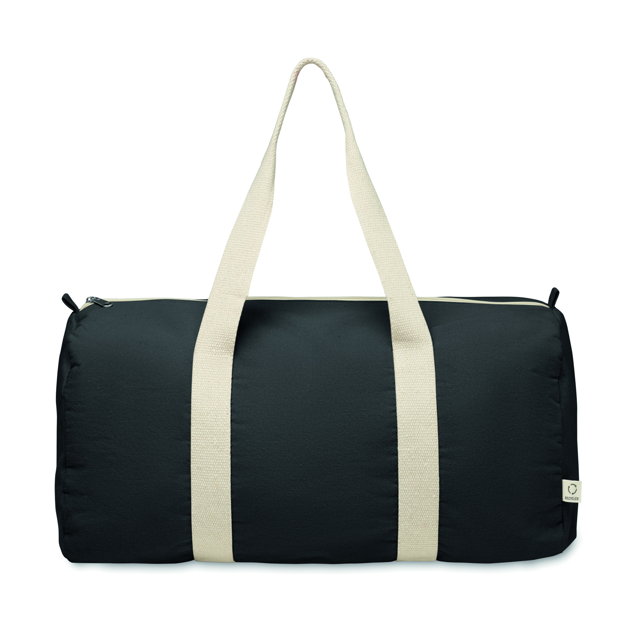 Duffle-, urheilu- tai matkalaukku, jossa on vetoketjullinen sivutasku ja vetoketjullinen sisätasku 320 g/m² kierrätyspuuvillaa (80 %) ja kierrätettyä polyesteriä (20 %) pitkällä kahvalla.