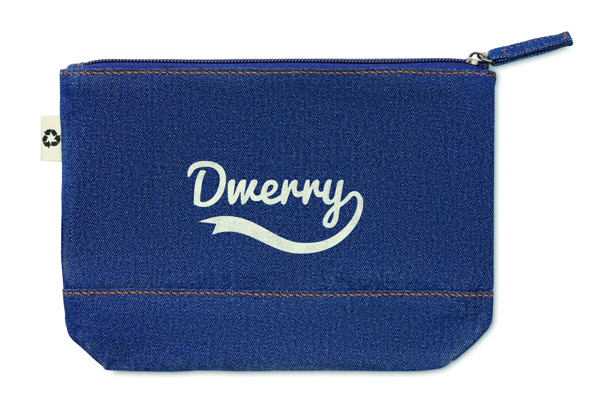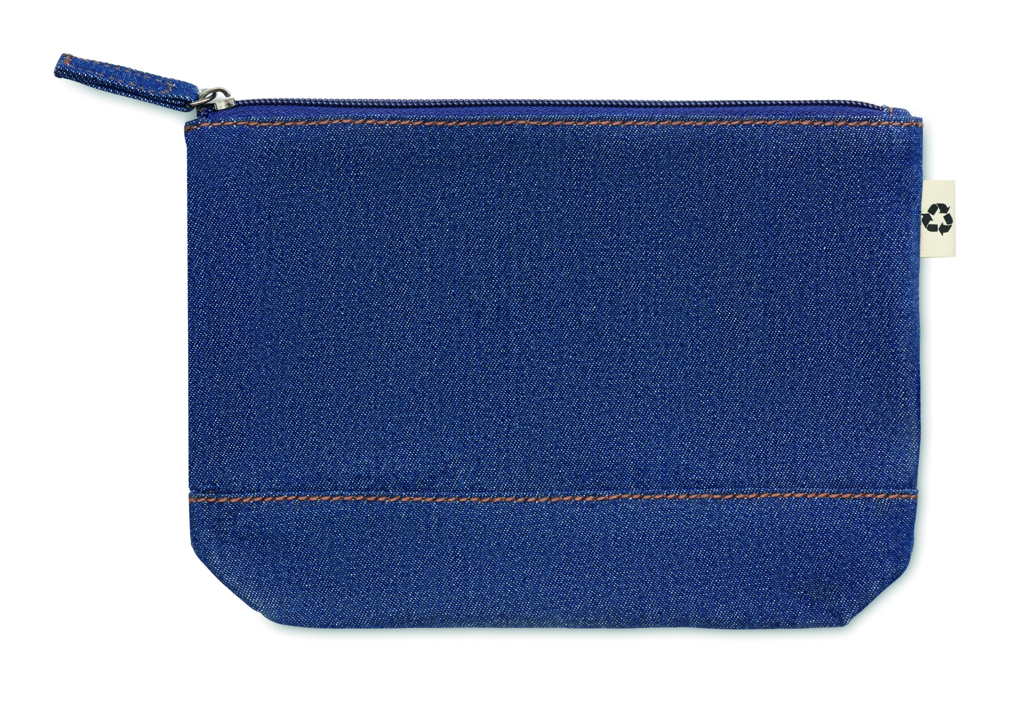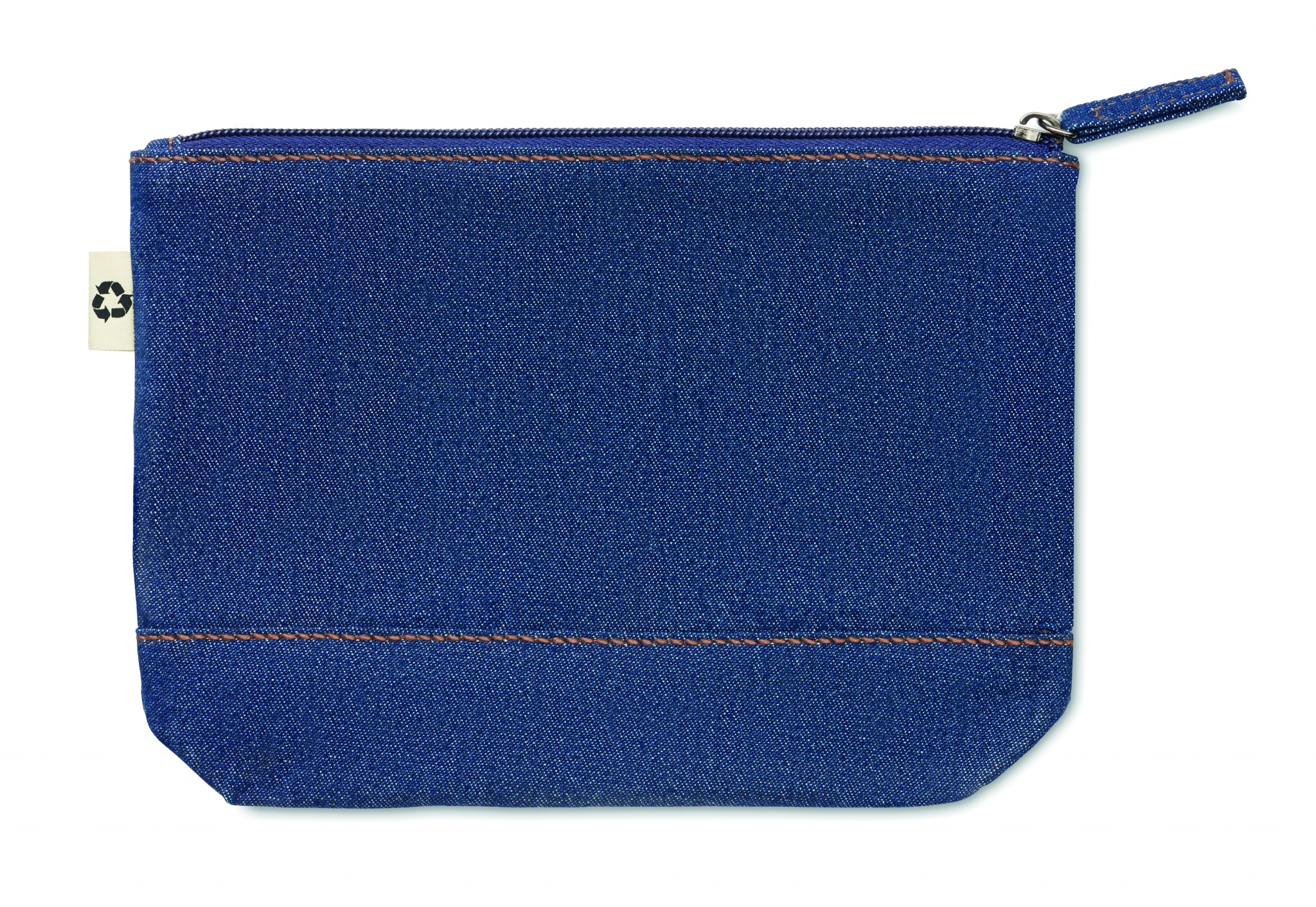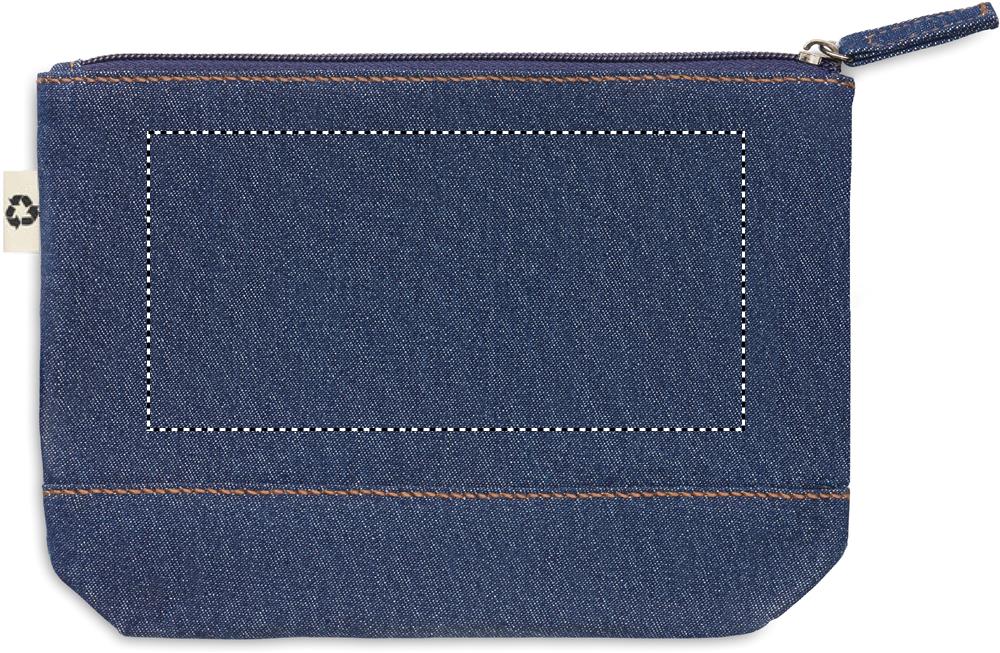 250 gr/m² kosmetiikkalaukku, valmistettu 50% kierrätetystä värjätystä denim puuvillasta ja 50% normaalista puuvillasta.