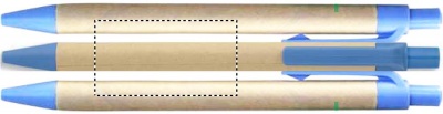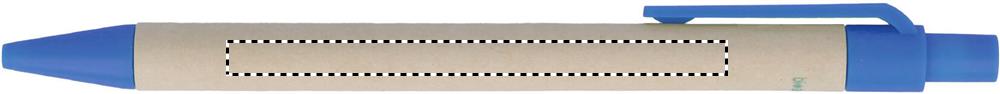 Painomekanismilla varustettu kuulakärkikynä sinisellä musteella, paperisella rungolla ja muoviosat polyaktidia (100% biohajoavaa maissia).