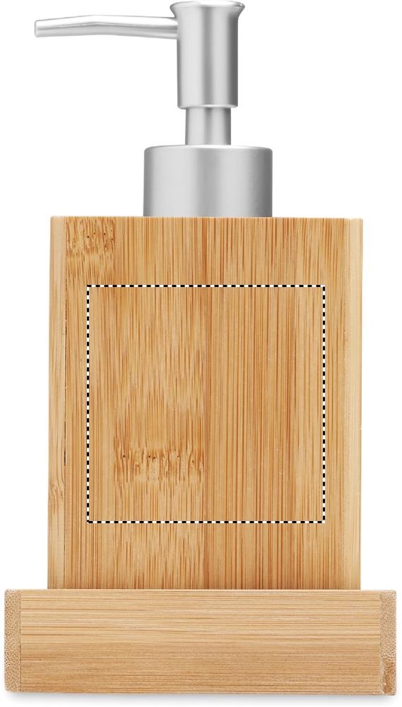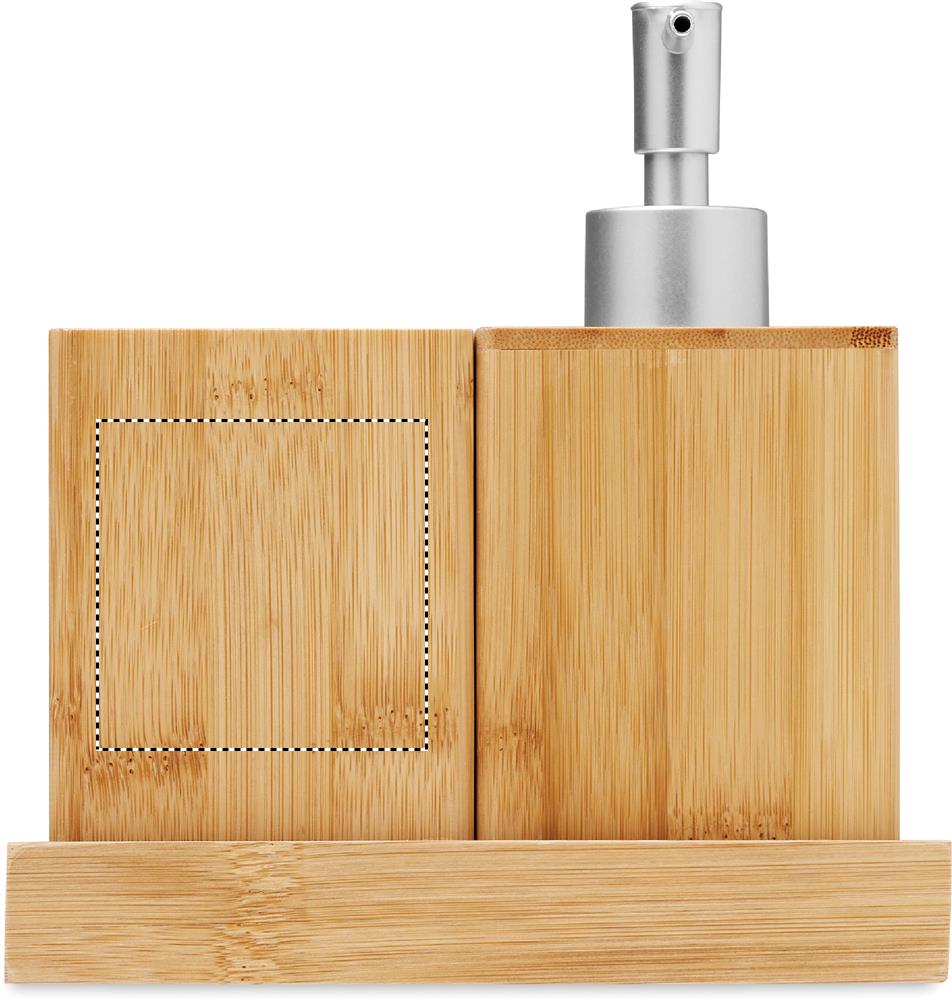 3-osainen bambusta valmistettu kylpyhuonetarvikesetti. Sisältää pumppupullon saippualle, hammasmukin ja näille alustan.