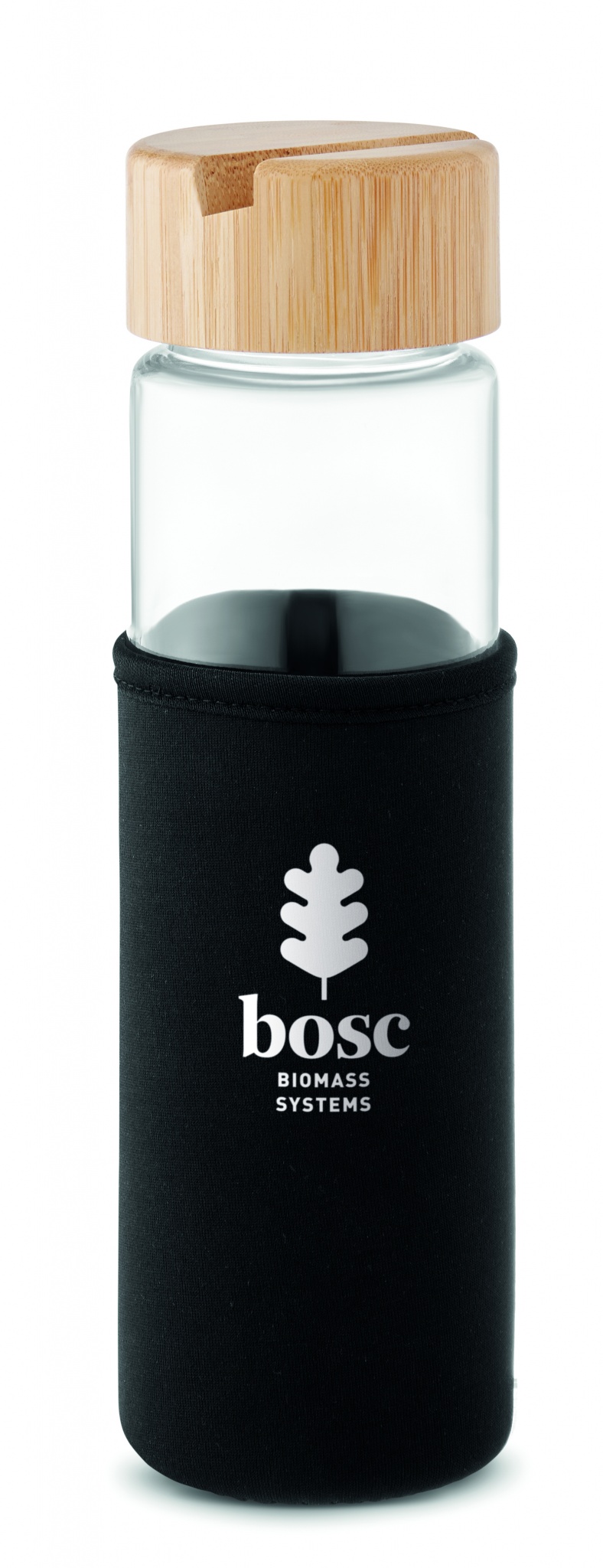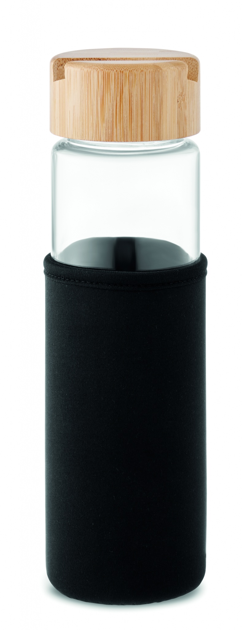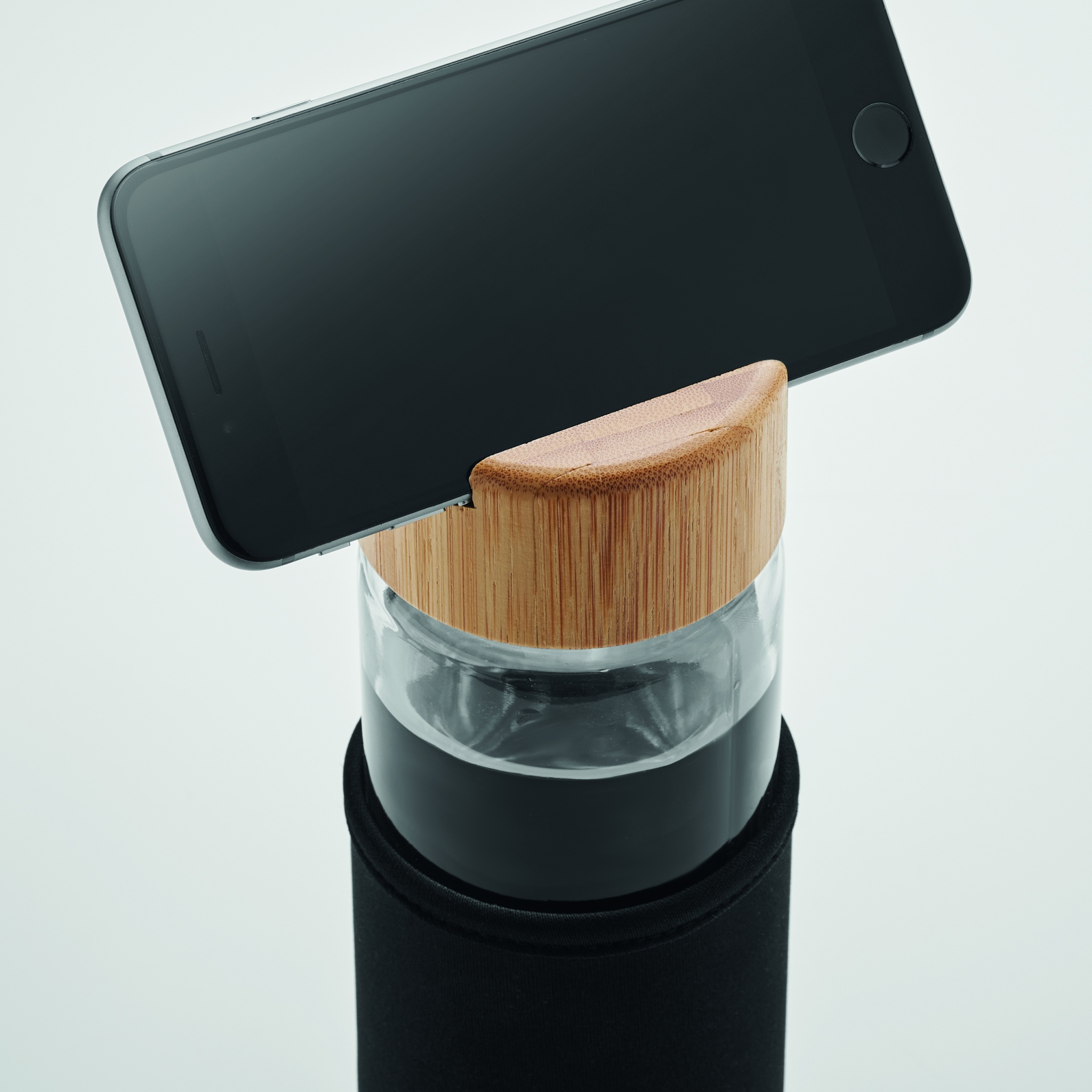 Lasipullo jossa neopreenisuojus ja bambukansi. Toimii myös puhelintelineenä. Vuotamaton. Tilavuus: 600 ml.