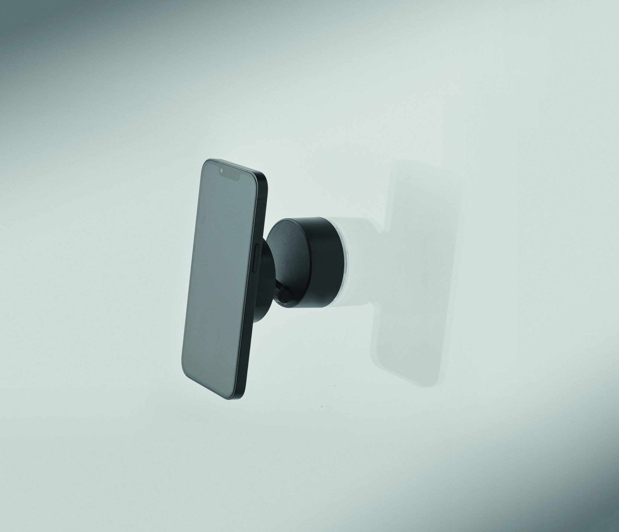 Magneettinen ABS-puhelinteline. Imukuppikiinnitys. Yhteensopiva iPhone® 12:n ja uudempien kanssa. Mukana ylimääräinen magneettinen metallirengas muiden ei-magneettisten langattomien ladattavien puhelimien lataamiseen.