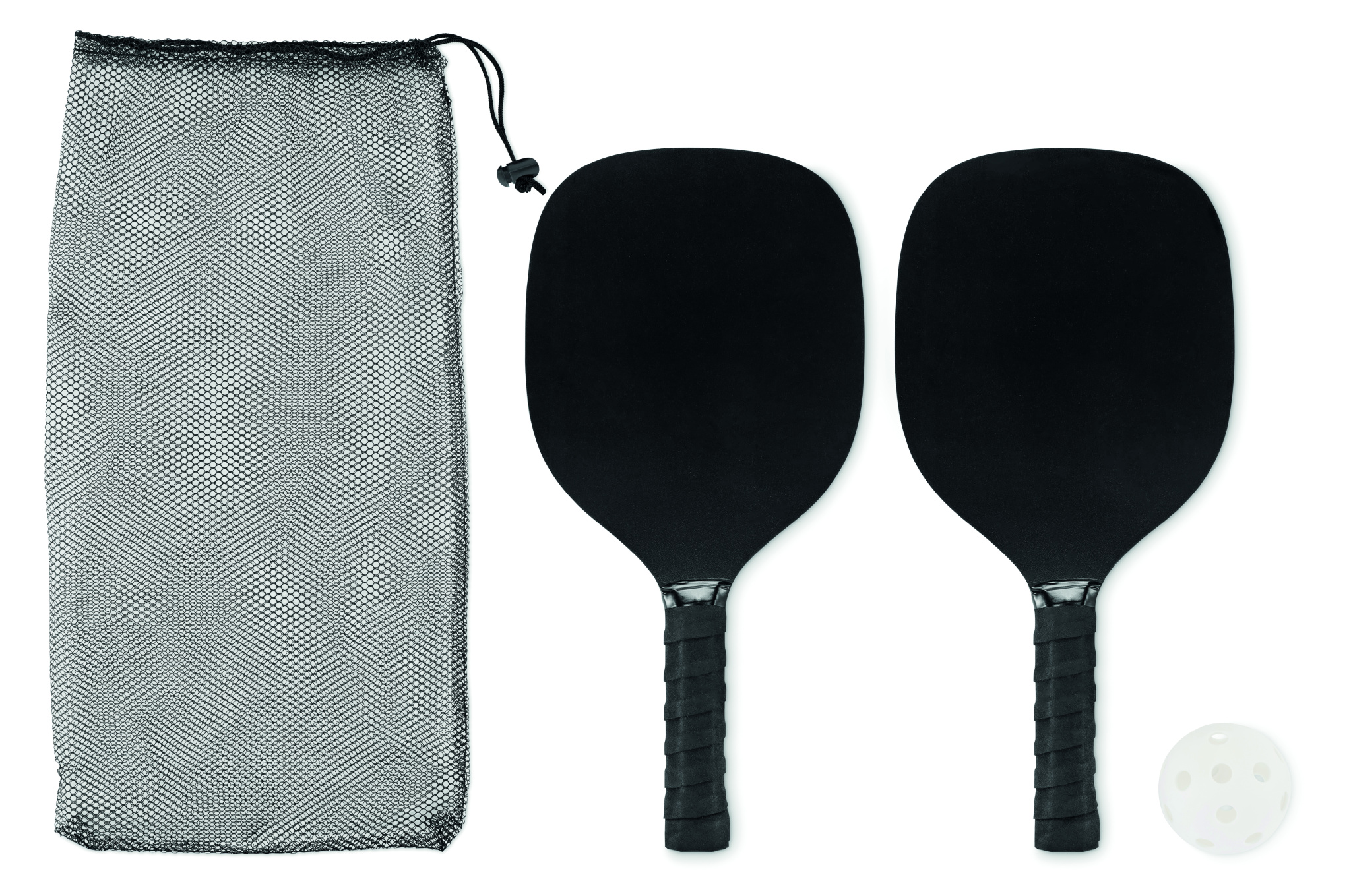 Pickle-pallomailasetti, jossa on kaksi MDF-puumailaa ja yksi pallo RPET-verkkoisesta kiristysnyörillä suljetussa pussissa.