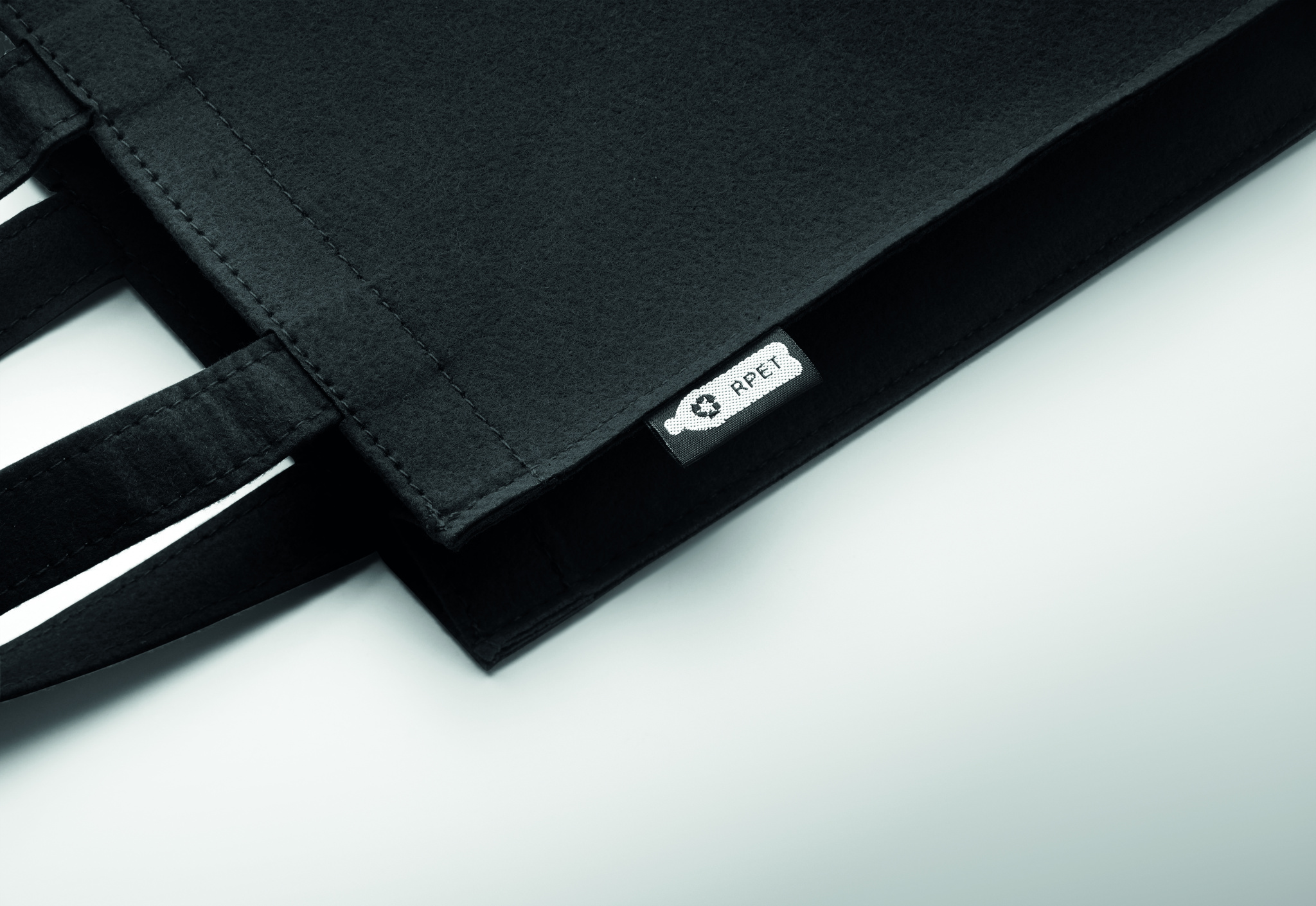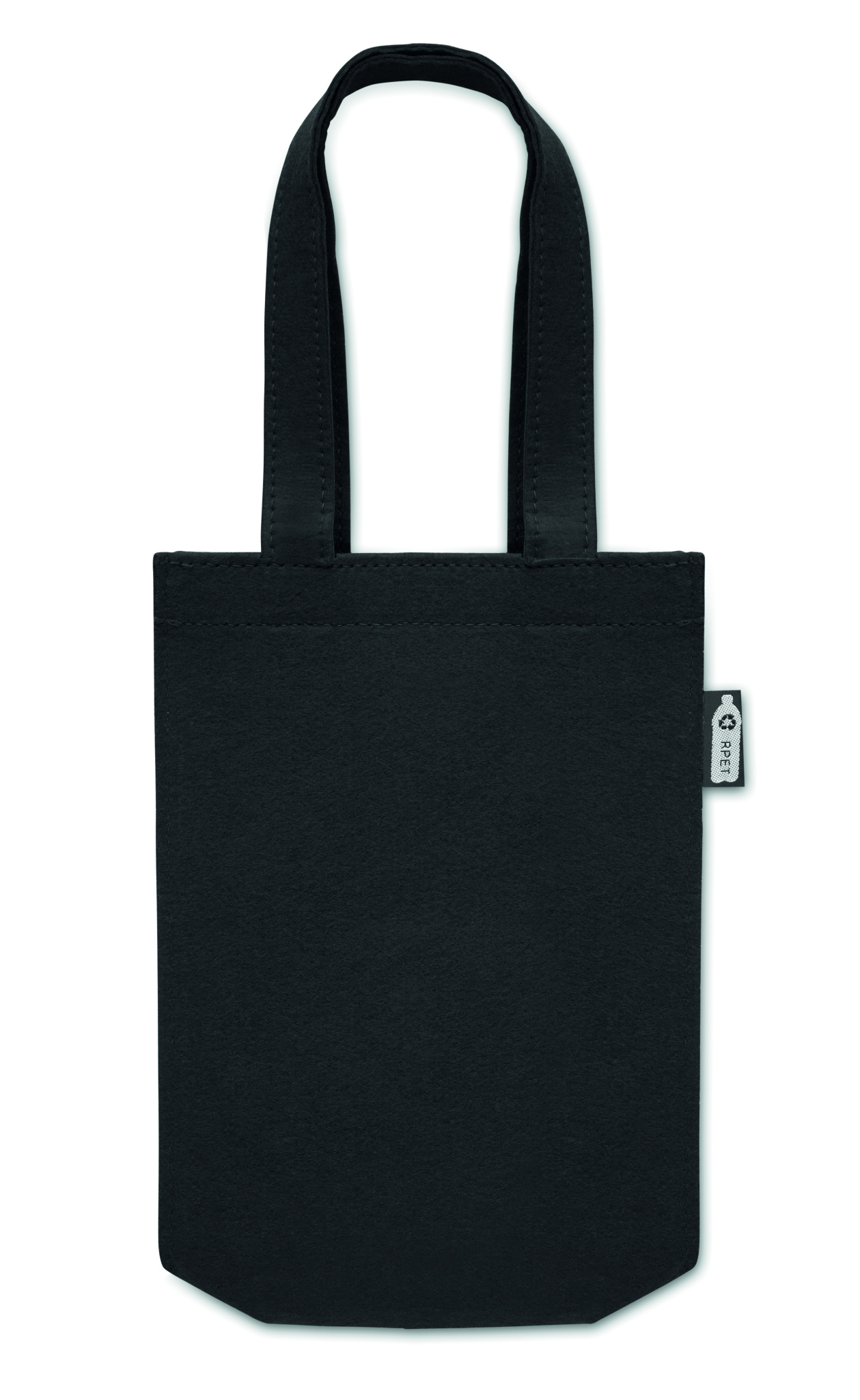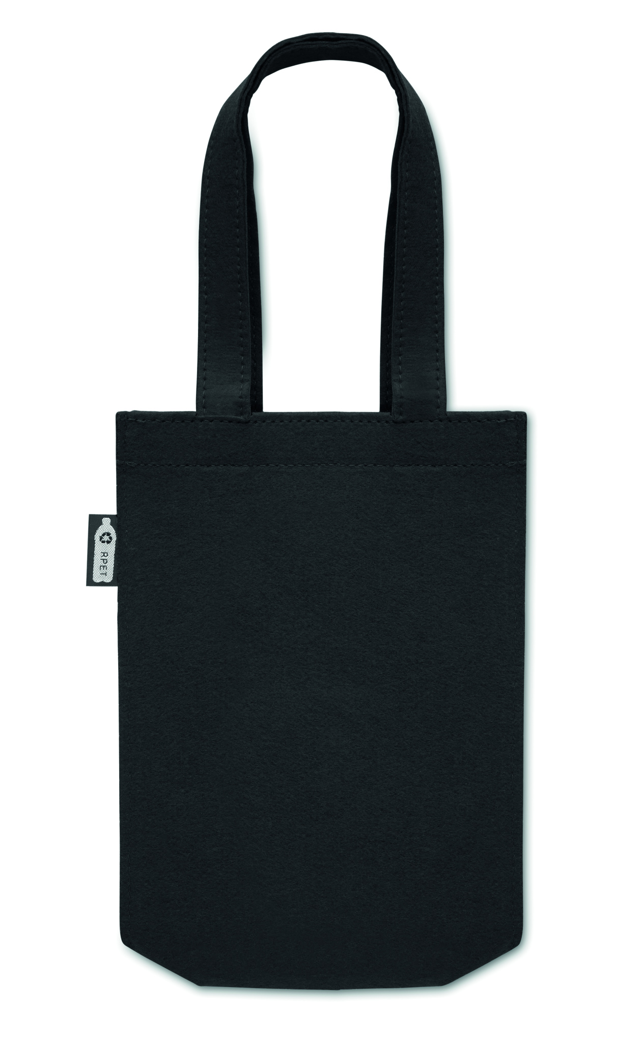 Pieni RPET-huopalahja- tai herkkulaukku, jossa lyhyet kahvat ja kulmakivet. Huovan paksuus: 1 mm.