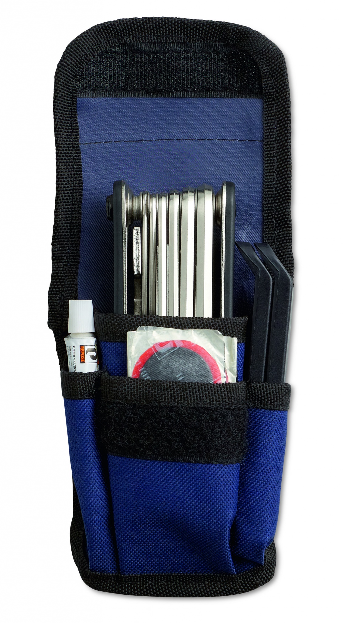 Polkupyörän korjaussarja, sisältää 15-osaisen monitoimityökalun, 2 rengasvipua, raastin, liima ja kumin paikat. Pakattuna pussiin, heijastavilla leikkausilla.