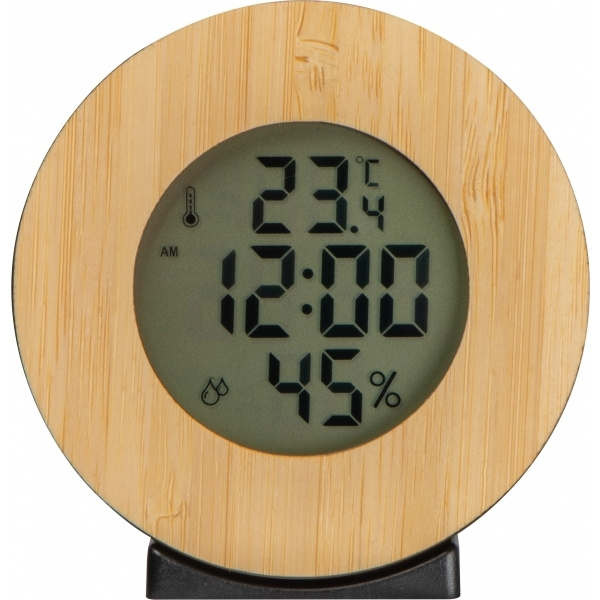 Digitaalinen sääasema bambuelementillä. Kellon (12h/24h) lisäksi siinä on hälytystoiminto, lämpömittari (°C/°F), kosteusmittari ja päivämääränäyttö. Logosi kaiverretaan bambusormukseen. Ei sisällä yhtä AAA-paristoa; tilaa se erikseen (tuotenumero 999400).