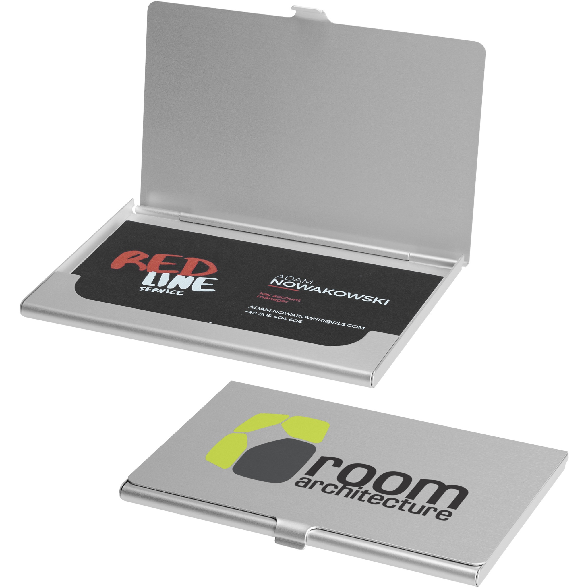Alumiininen käyntikorttikotelo, johon mahtuu noin 10 käyntikorttia.