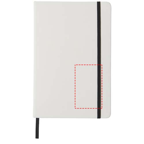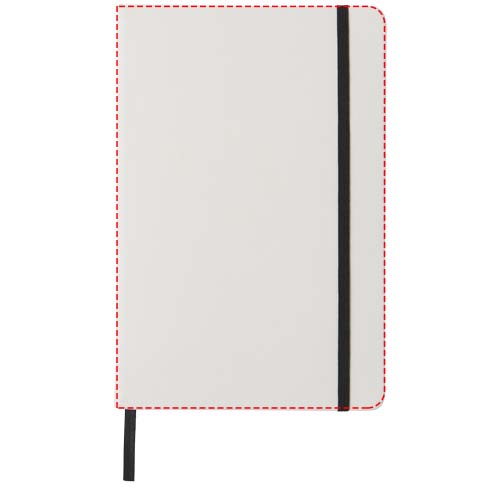 Valkoinen A5 muistikirja värillisellä joustavalla suljentanauhalla ja sivumerkillä. 80 sivua (60g/m2) viivoitettua paperia. Kansi voidaan digipainaa.