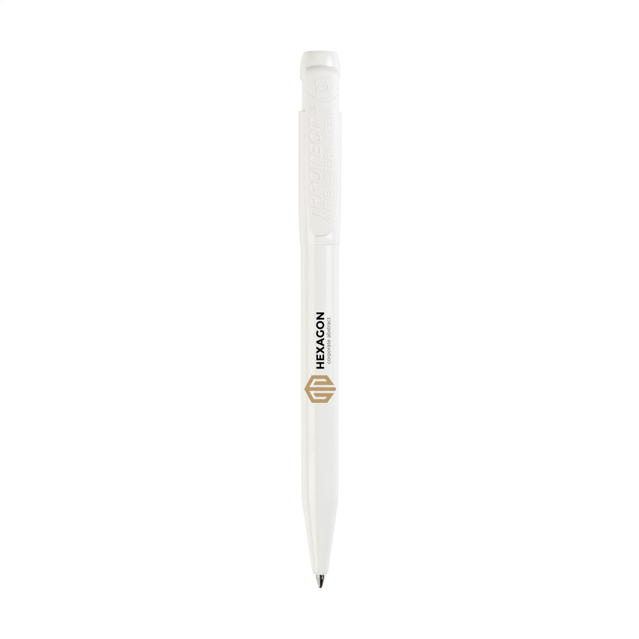 Stilolinea® kuulakärkikynä sinisellä musteella ja värillisellä klipsillä/painikkeella. Tällä kuulakärkikynällä on antibakteerinen vaikutus. Valmistettu Italiassa.