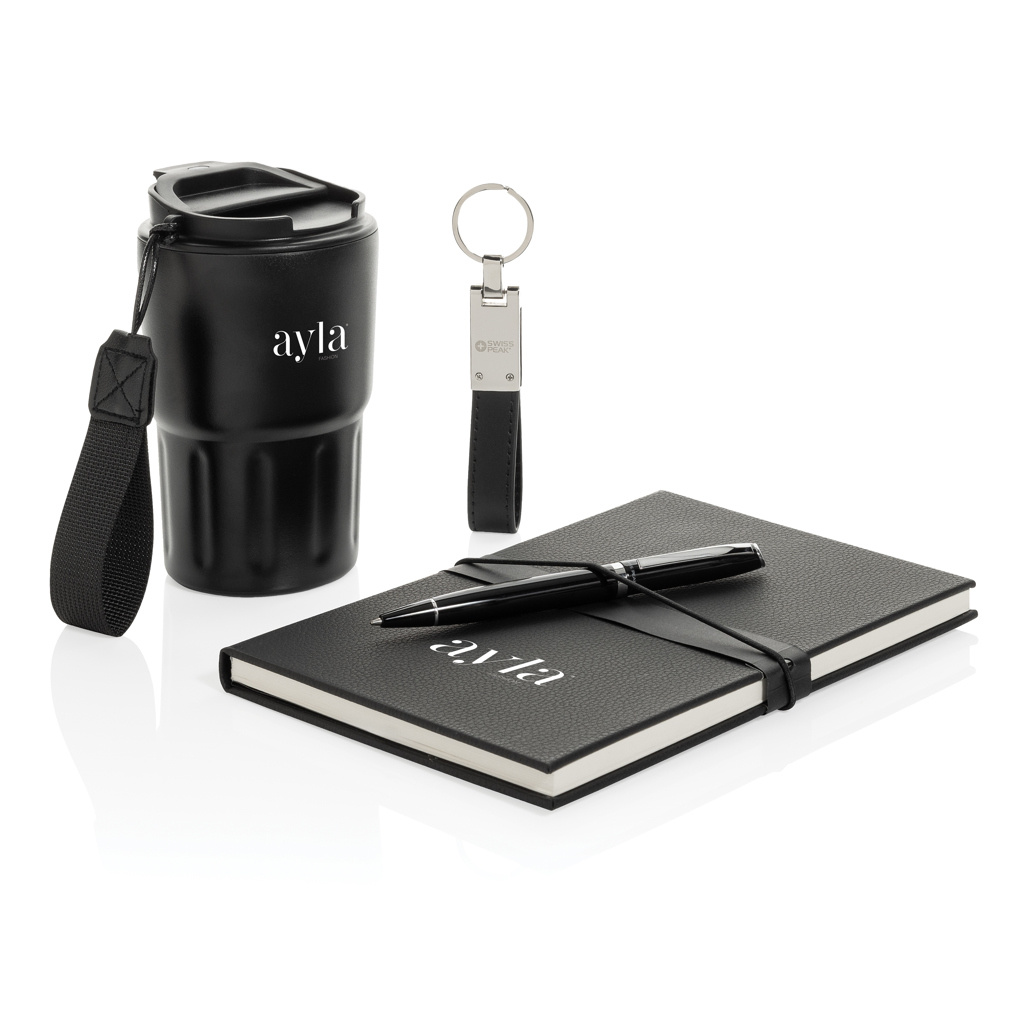 Tämä ylellinen lahjasetti sisältää kaikki tärkeimmät tarvikkeet, joiden avulla työpäivä sujuu tyylikkäästi. 350 ml:n kaksiseinäinen termosmuki on vakuumieristetty, joten juomasi pysyy kuumana tai kylmänä pitkään. Vuotamaton kansi takaa, että vaatteesi pysyvät kuivina, vaikka muki kallistuisi tai ei olisi pystyasennossa. Tärkeimmät avaimet pysyvät aina käden ulottuvilla laadukkaan Swiss Peak -avaimenperän avulla, jossa on kiiltävä metalliviimeistely ja kauniisti viimeistelty PU-nahkahihna. Tarvitsetko paikan muistiinpanoille tai ideoille? Settiin kuuluu myös tyylikäs kuulakärkikynä, jolla voi kirjoittaa jopa 1000 metriä, sekä pehmeäpintainen PU-muistikirja, joka on valmistettu kierrätetystä polyesterista. Muistikirjassa on 160 kerma­sävyistä sivua kierrätyspaperista. Kaikki lahjasetin tuotteet ovat RCS-sertifioituja, mikä takaa täysin todennetun toimitusketjun kierrätysmateriaaleille. Setin tuotteista 75 % koostuu kierrätetystä materiaalista.