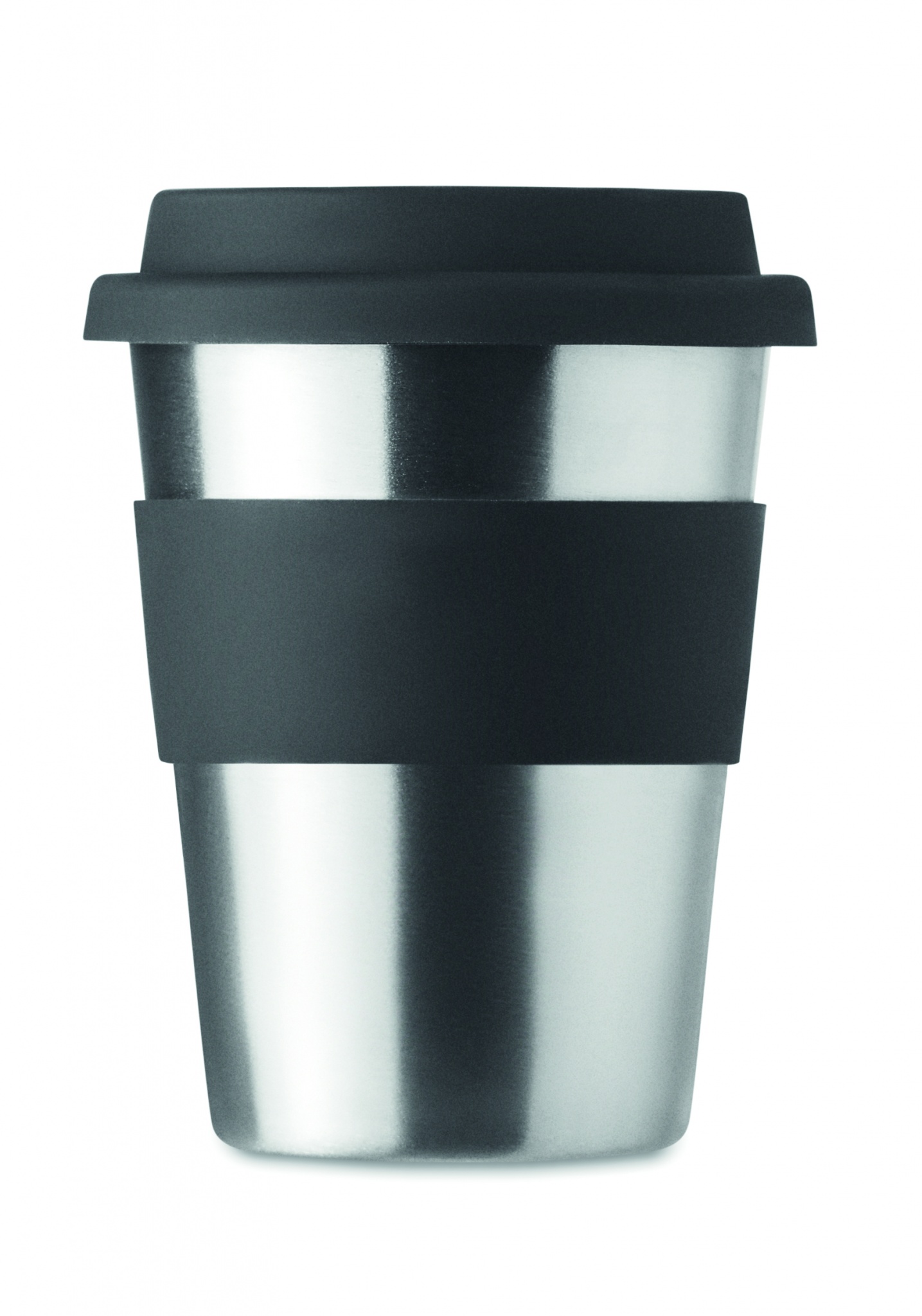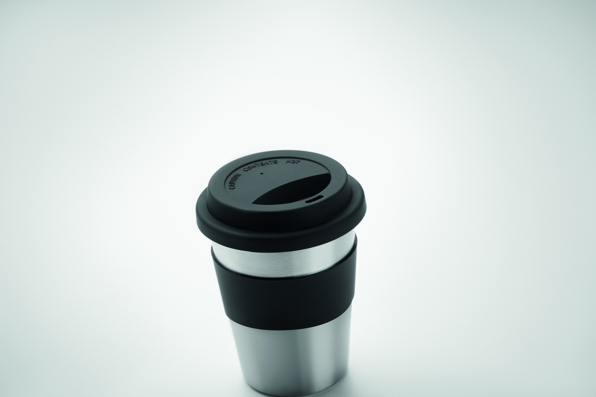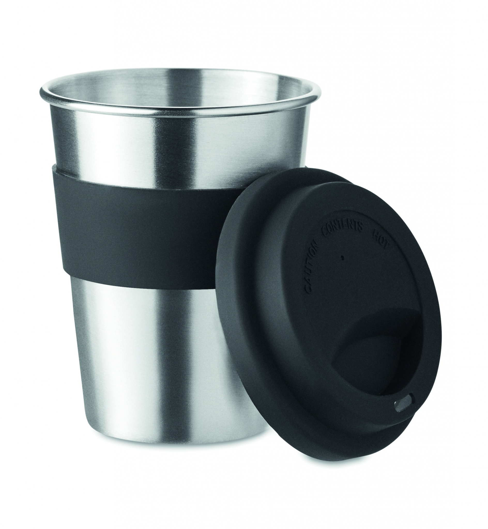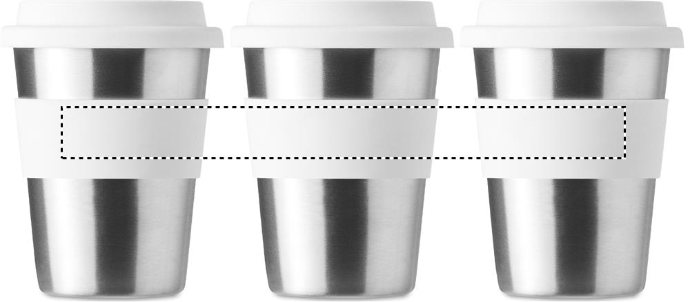 Yksiseinäinen ruostumattomasta teräksestä valmistettu 350 ml takeaway muki, silikoni kannella ja vyötteellä. Tuote voi kuumentua ulkoisesti.