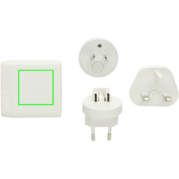 Lataa missä tahansa Travelcharge Pro -laitteella. Siinä on 2 USB C -porttia ja 2 USB A -porttia, joiden avulla voit ladata minkä tahansa mobiililaitteen, jonka otat mukaan matkoillesi. Integroitu pistoke Yhdysvaltoja varten ja lisäksi EU:n, Yhdistyneen kuningaskunnan ja AUS:n pistoke, jolla voit ladata yli 100 maassa ympäri maailmaa. Max: 5V/3A. Sisääntulo: 1,5 mm: AC100-240V. Sovitin toimitetaan kätevässä matkapussissa, jotta voit tuoda sen mihin tahansa kohteeseen. Laturi on valmistettu kierrätetystä ABS:stä. Kokonaisuudessaan kierrätettyä sisältöä: 57 % tuotteen kokonaispainosta. RCS-sertifiointi takaa täysin sertifioidun toimitusketjun kierrätysmateriaaleille. PVC-vapaa. Pakattu FSC® mix -pakkaukseen.