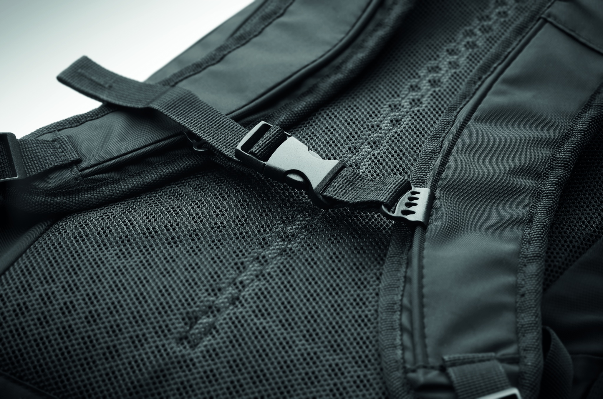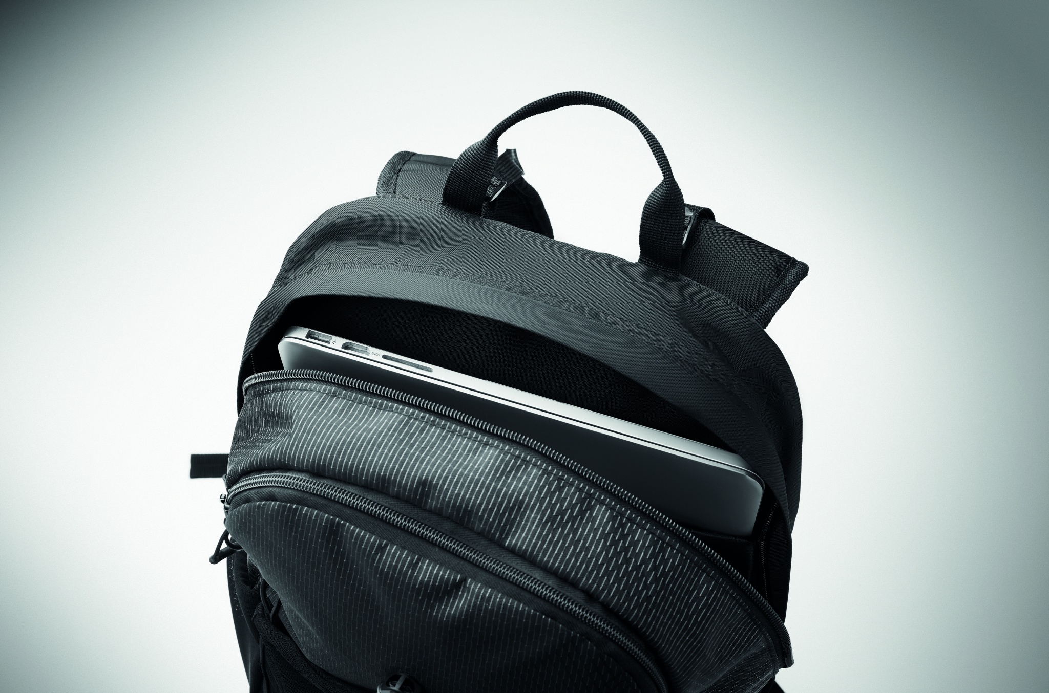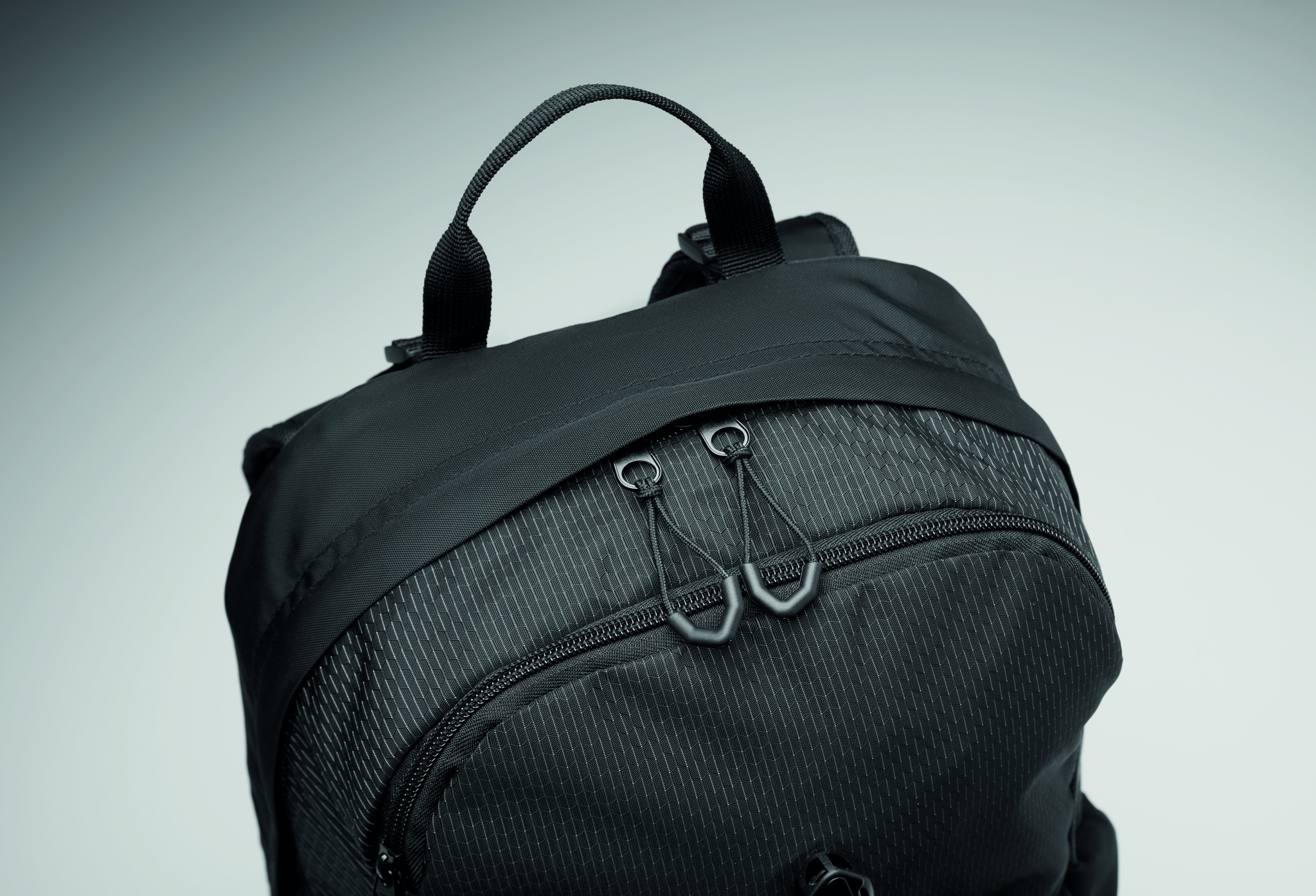 Retkeilyreppu 18L vettä hylkivää 420D nylonia, jossa on heijastava raita. Siinä on lokero 15'' ''tietokoneelle. Yksi vetoketjullinen etulokero ja yksi edessä oleva liukutasku, jossa on solkisuljenta. Kaksi sivutaskua. Pehmustetut selkä- ja olkahihnat.