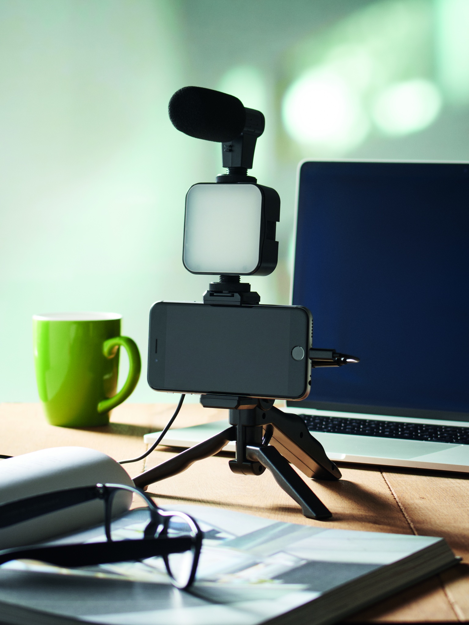 Lisävarusteet luovaan älypuhelimella kuvaamiseen. Sisältää säädettävän pöytäjalustan, jossa on puhelimen kiinnitys Shot gun -mikrofoniin, äänikaapelin ja 3,5 mm:n liitäntäsovitin sekä LED-valon, jossa on 10 valoasetusta. Ei sisällä 2 x AA paristoa.