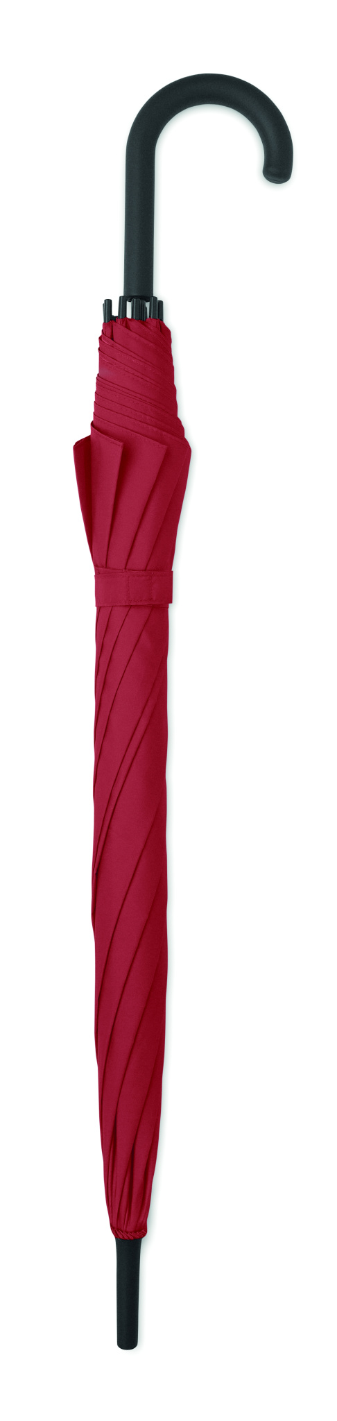 23 collu taisns, automātiski atverams lietussargs ar melni pārklātu metāla rāmi, stiklšķiedras ribām un paneļiem no 190T pongee auduma. Plastmasas gali un augšdaļa. Gumijots PP plastmasas izliekts rokturis. Manuāla aizdare.