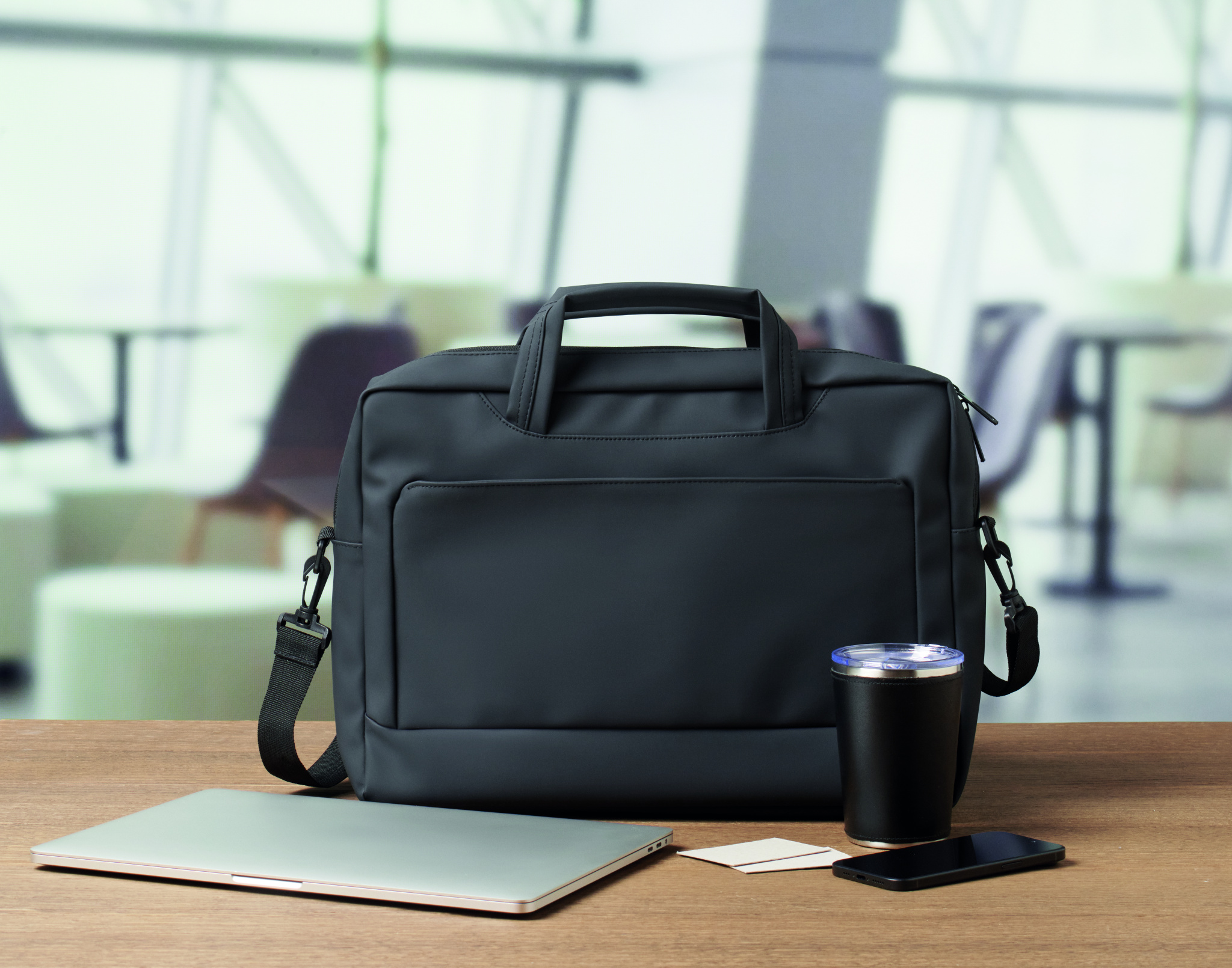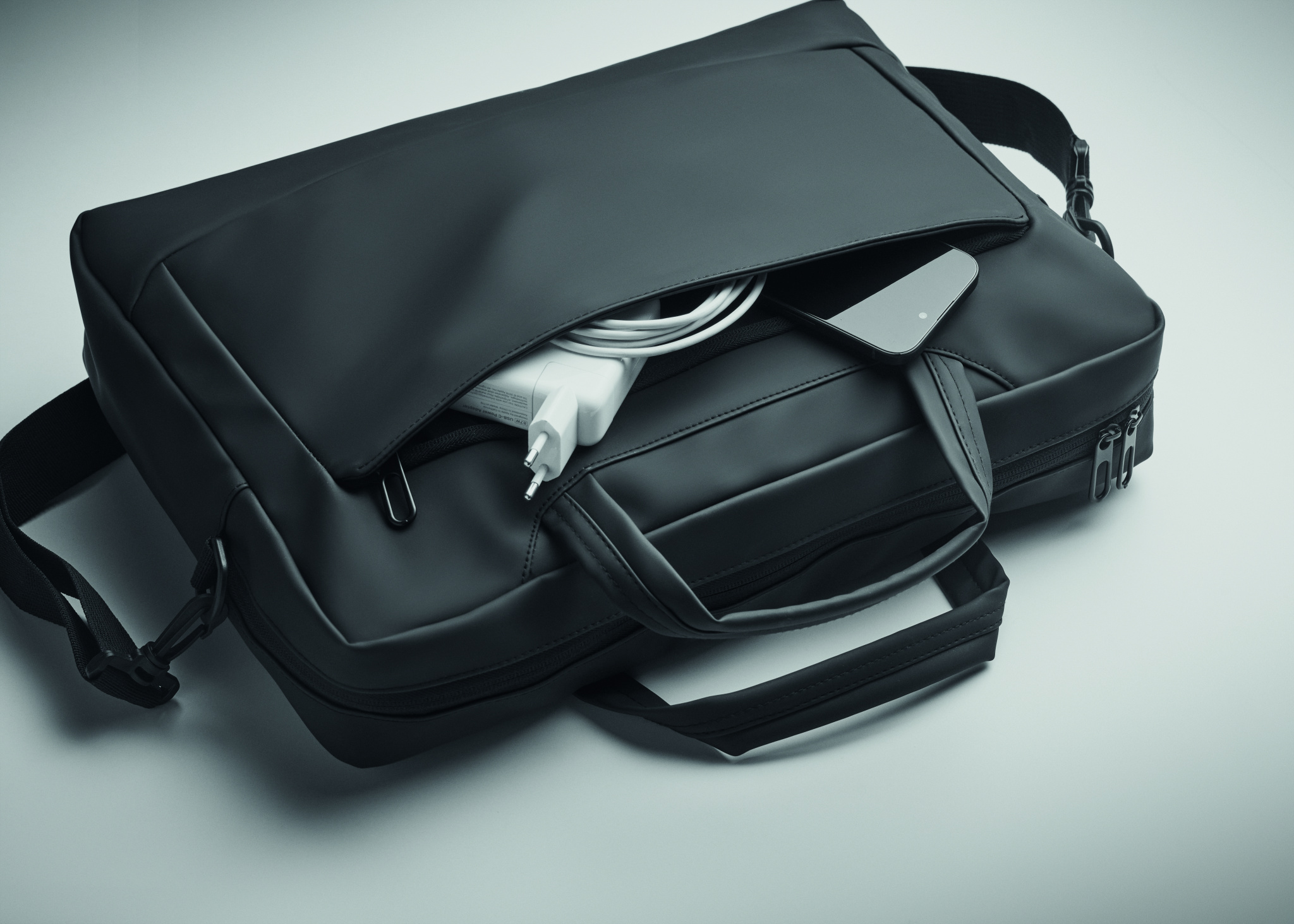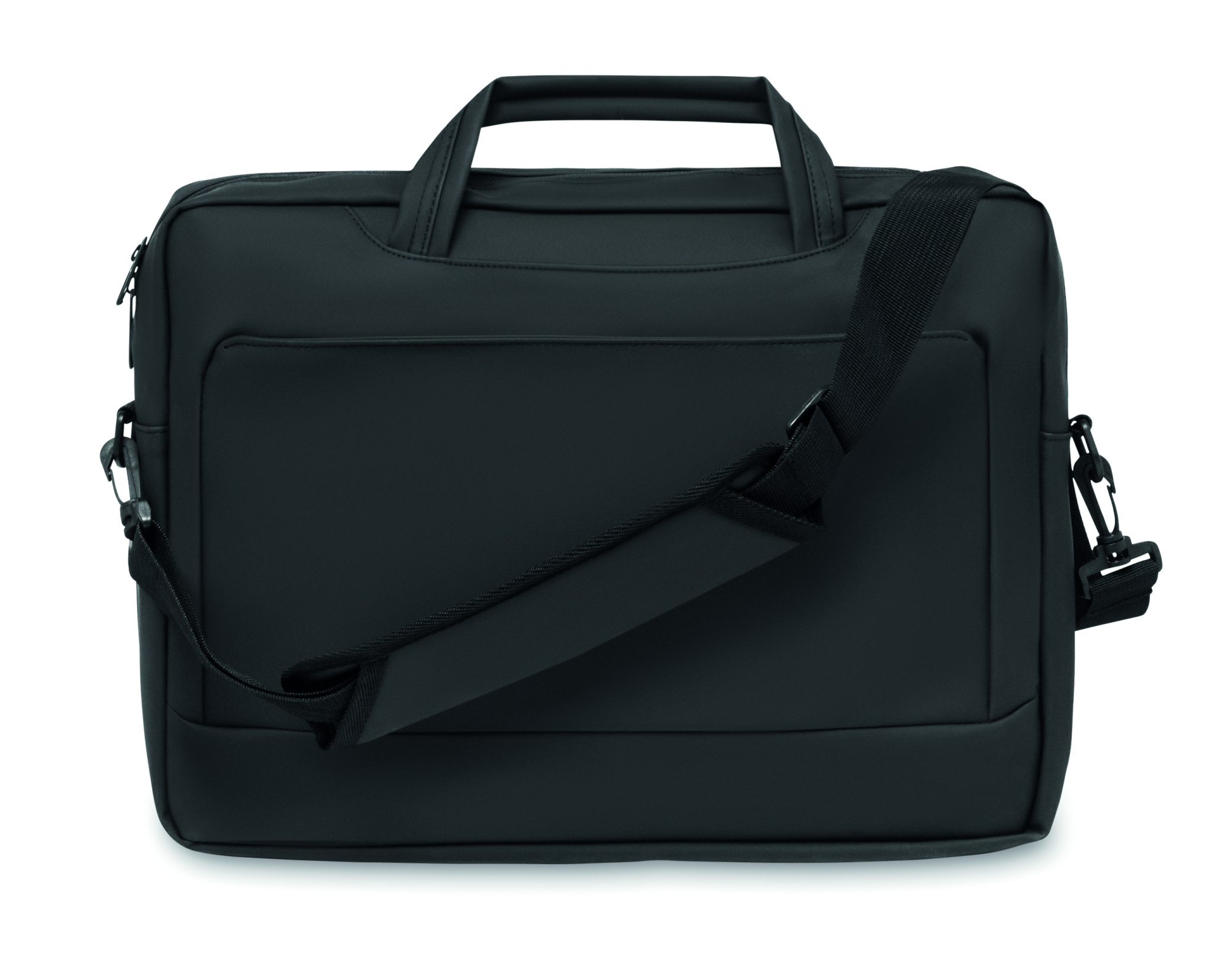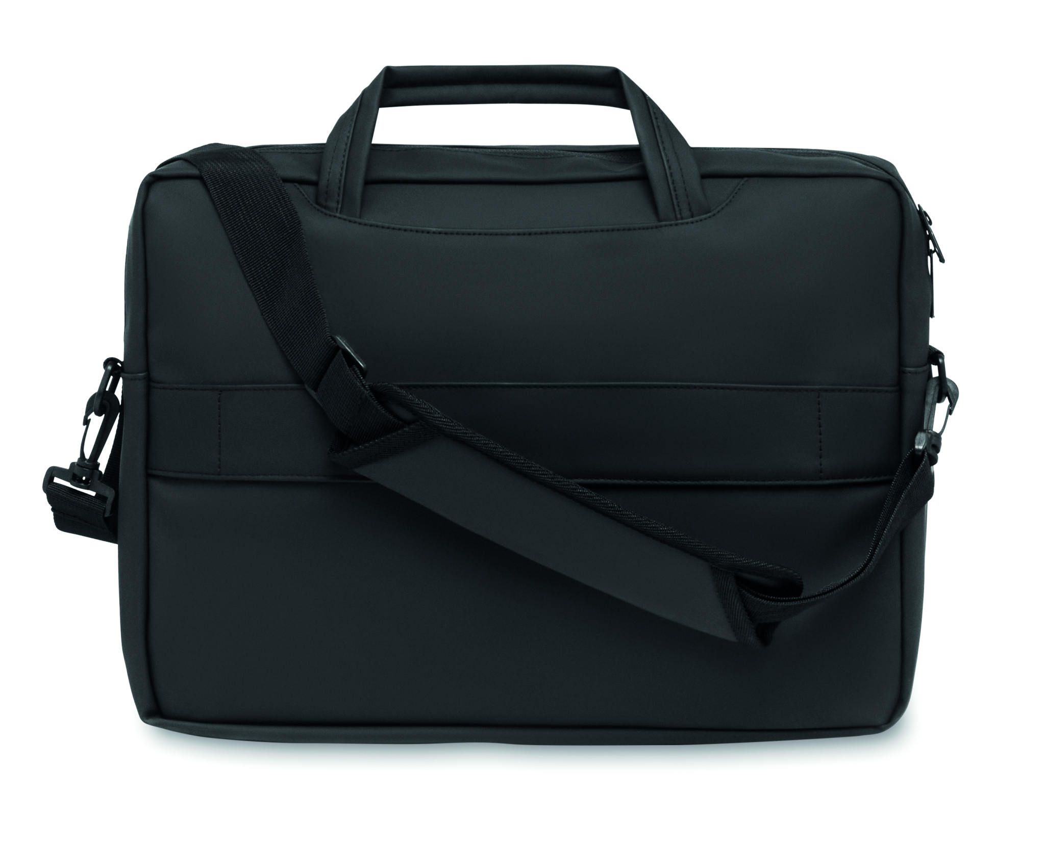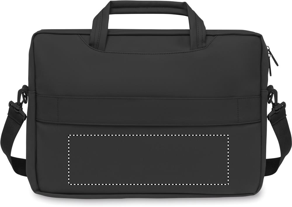 15 inch laptop document bag in soft PU with padded back . One main padded laptop compartment and zippered front pocket with several compartments. 210D RPET polyester lining. 2 handles and one adjustable and detachable shoulder strap with protection and trolley holder on back side.