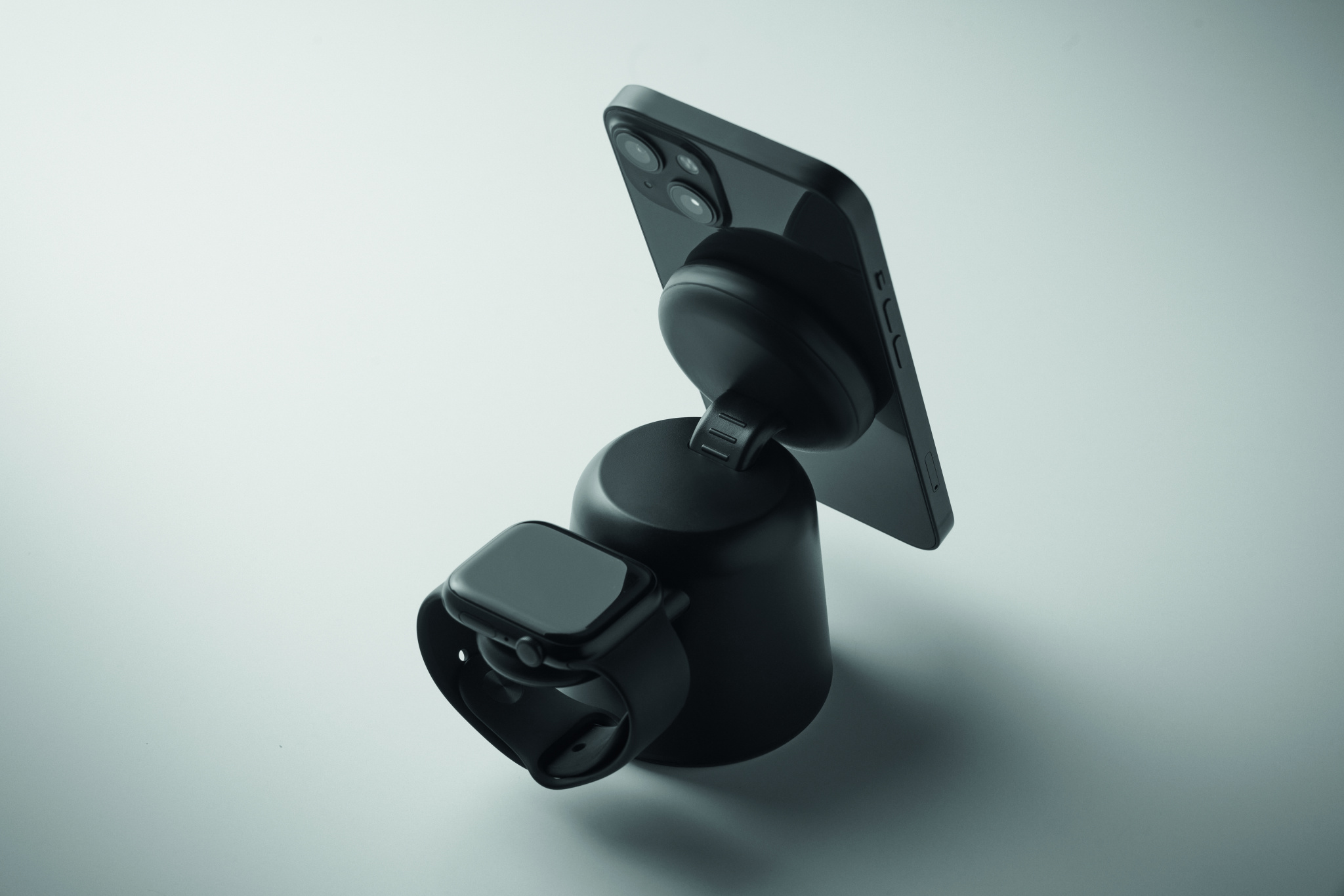 3 in 1 charging station in ABS. Includes 15W magnetic wireless charger for phone and TWS with phone holder functionality and smartwatch charger (iOS only). Magnetic feature compatible with iPhone® 12 and newer. Including additional magnetic metal ring to support charging of other non-magnetic wireless chargeable phones.
