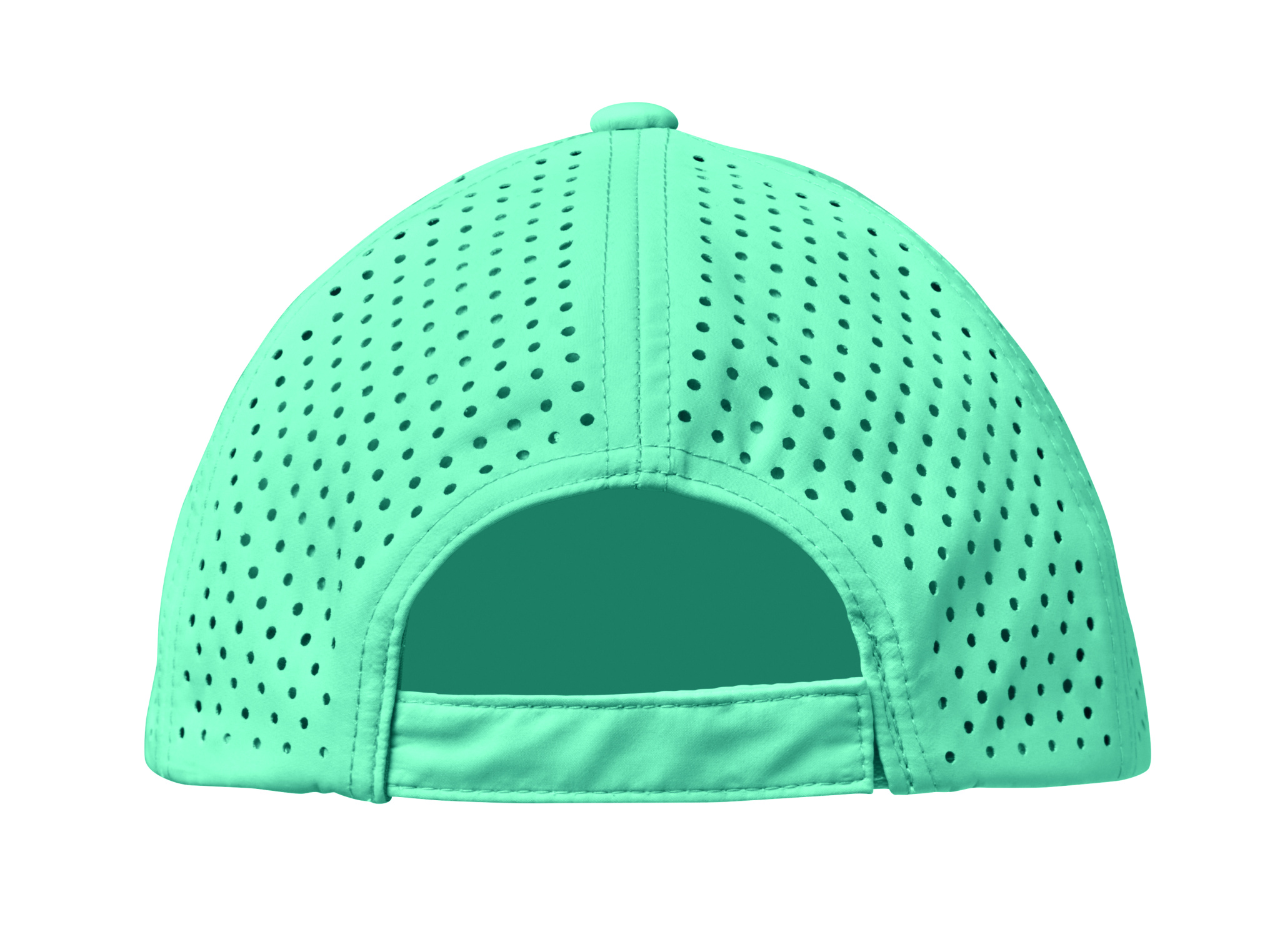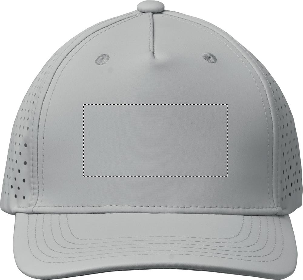 5 panel polyester performance cap with adjustable hook and loop closure and laser perforated holes with 2 stitched eyelets in matching colour. Item is quick dry, sweat and water repellent. 200 gr/m²