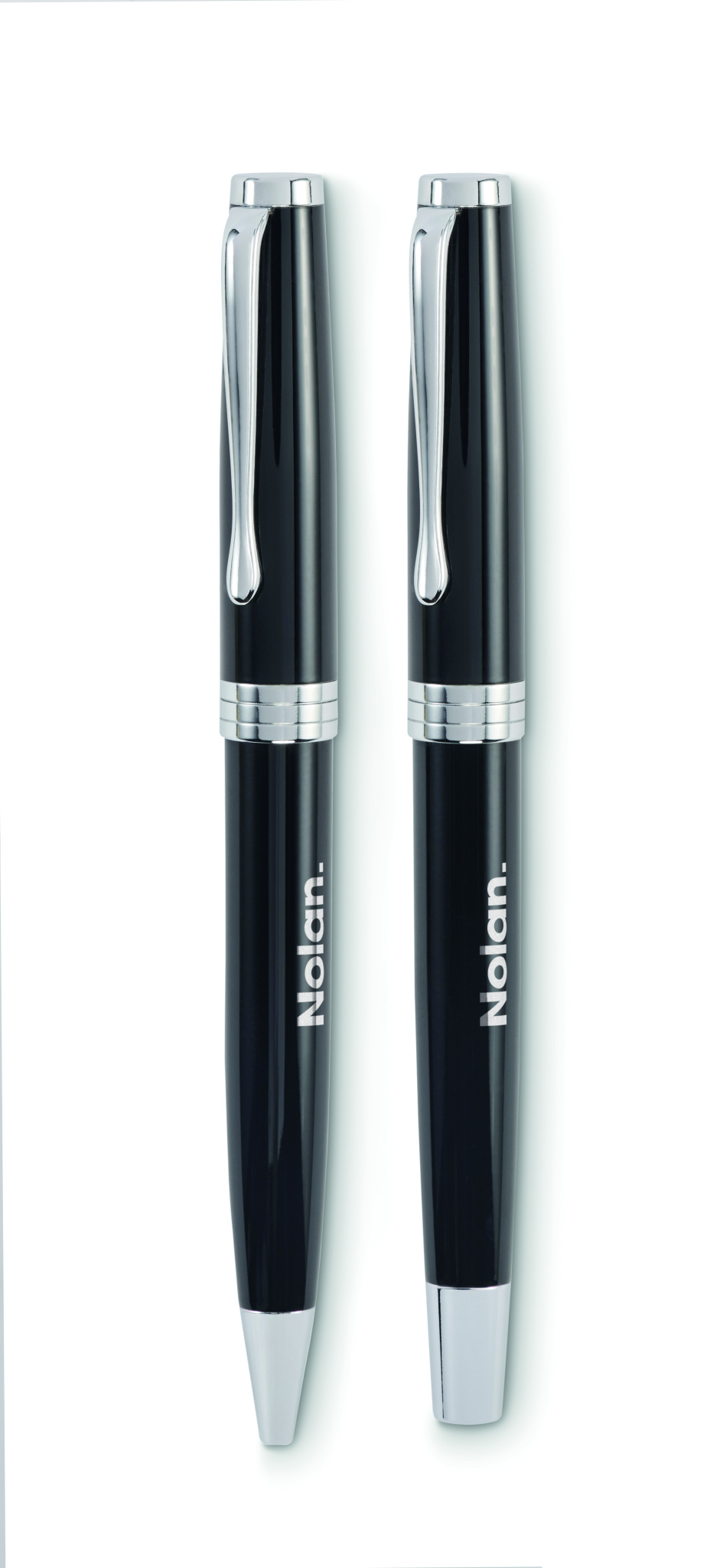 Set of twist ball pen and roller in recycled stainless steel barrel. Blue and black ink respectively. Presented in gift box.