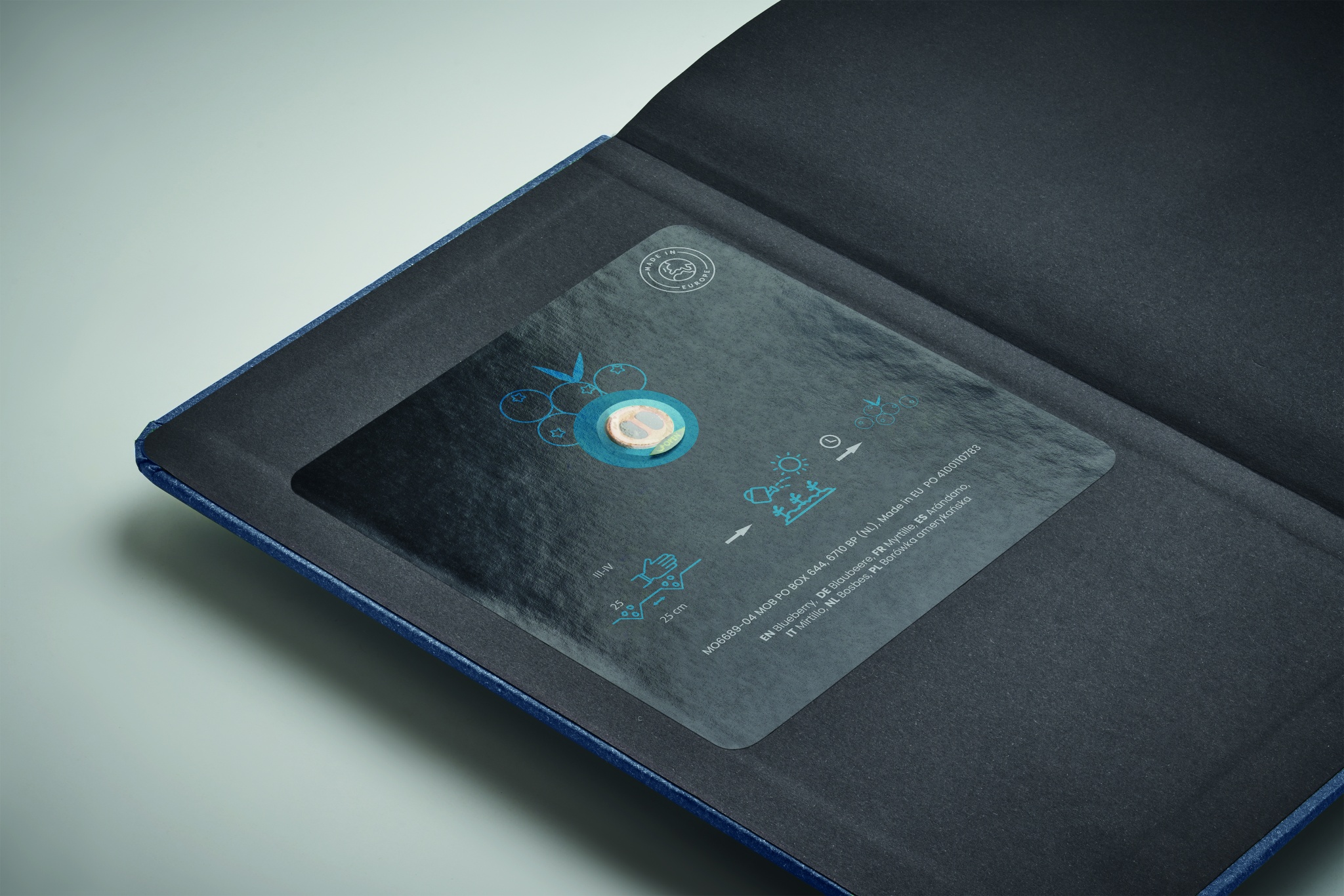 Блокнот формата A5 с обложкой из прочной твердой бумаги. В переплете. 184 линованные страницы (92 листа) из переработанной бумаги. Закладка из хлопка. Включает семена для посева. Сделано в ЕС.
