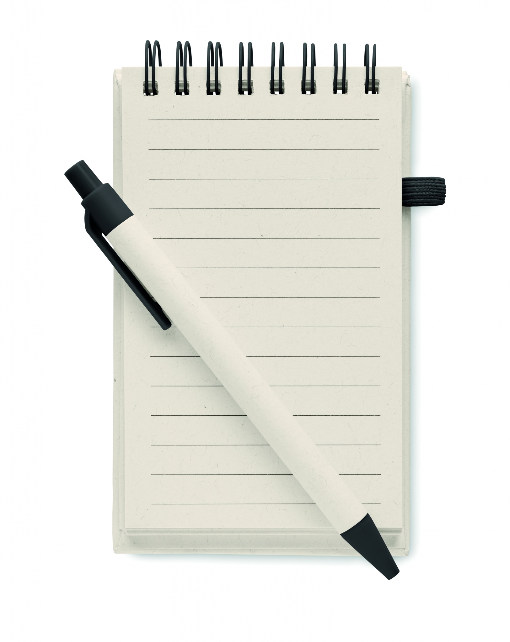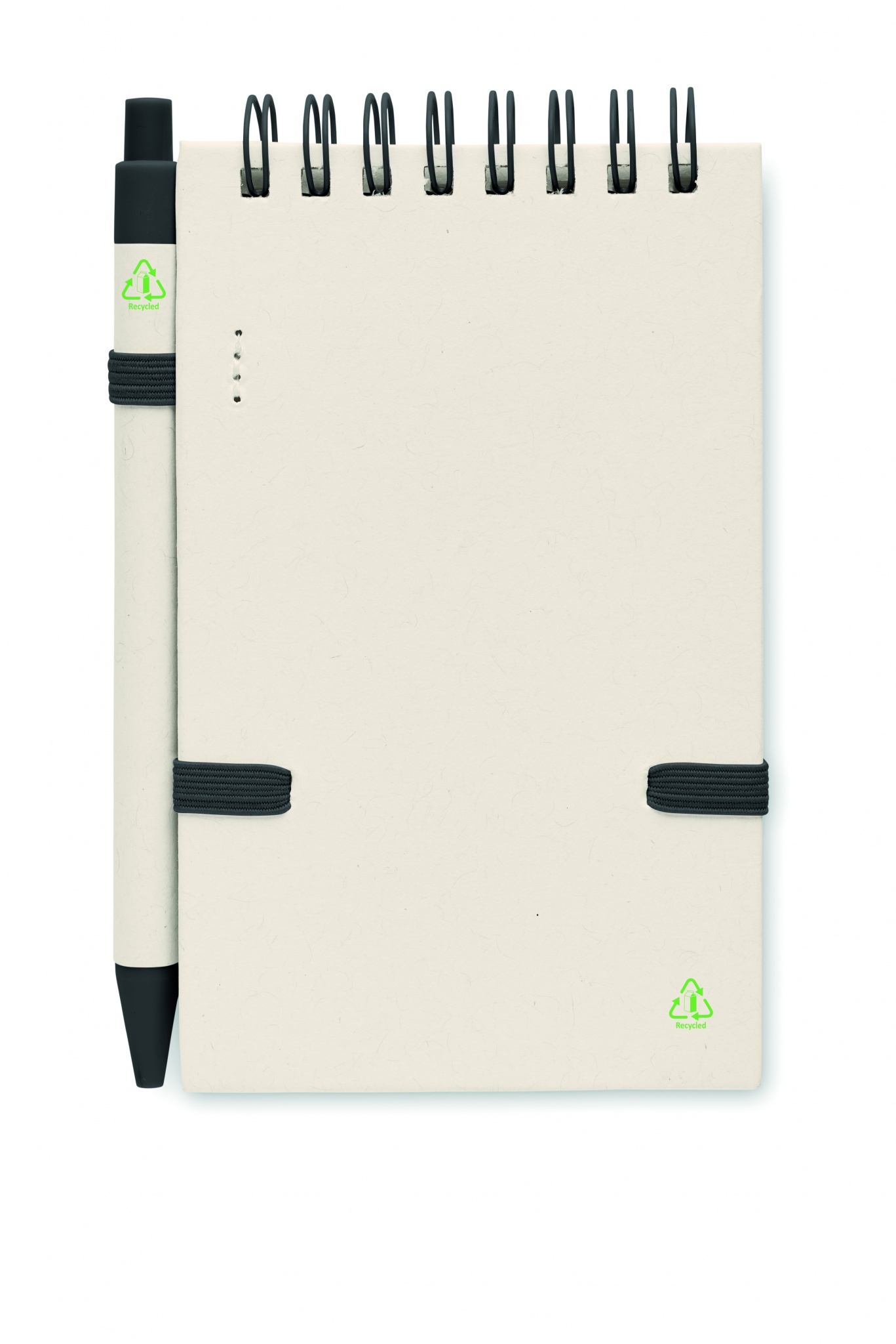 Блокнот A6 из переработанного картона на резинке. 70 листов (70% переработанного картона и 30% переработанной бумаги) в комплекте с ручкой. Синие чернила. Кольцевое скрепление. Держатель для ручки.