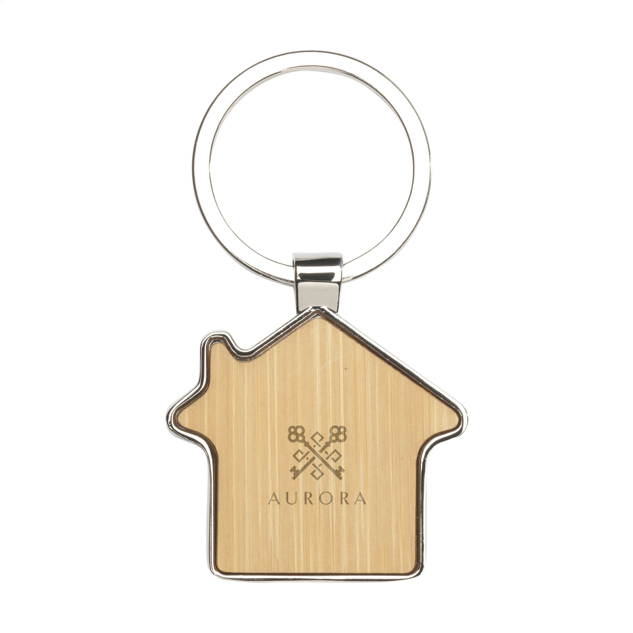 Брелок в форме домика. С полированным металлическим корпусом и бамбуковой деревянной инкрустацией. Каждый предмет поставляется в индивидуальном коричневом картонном конверте.