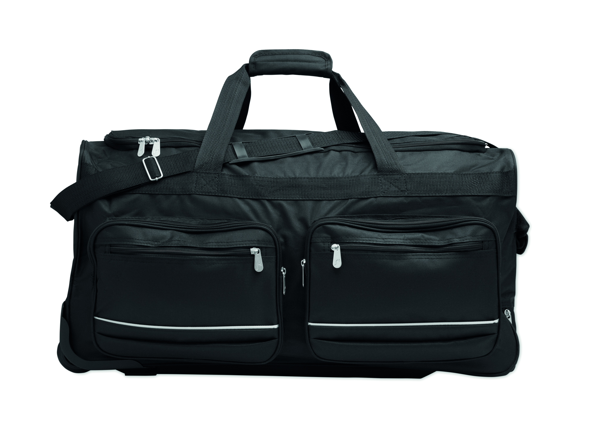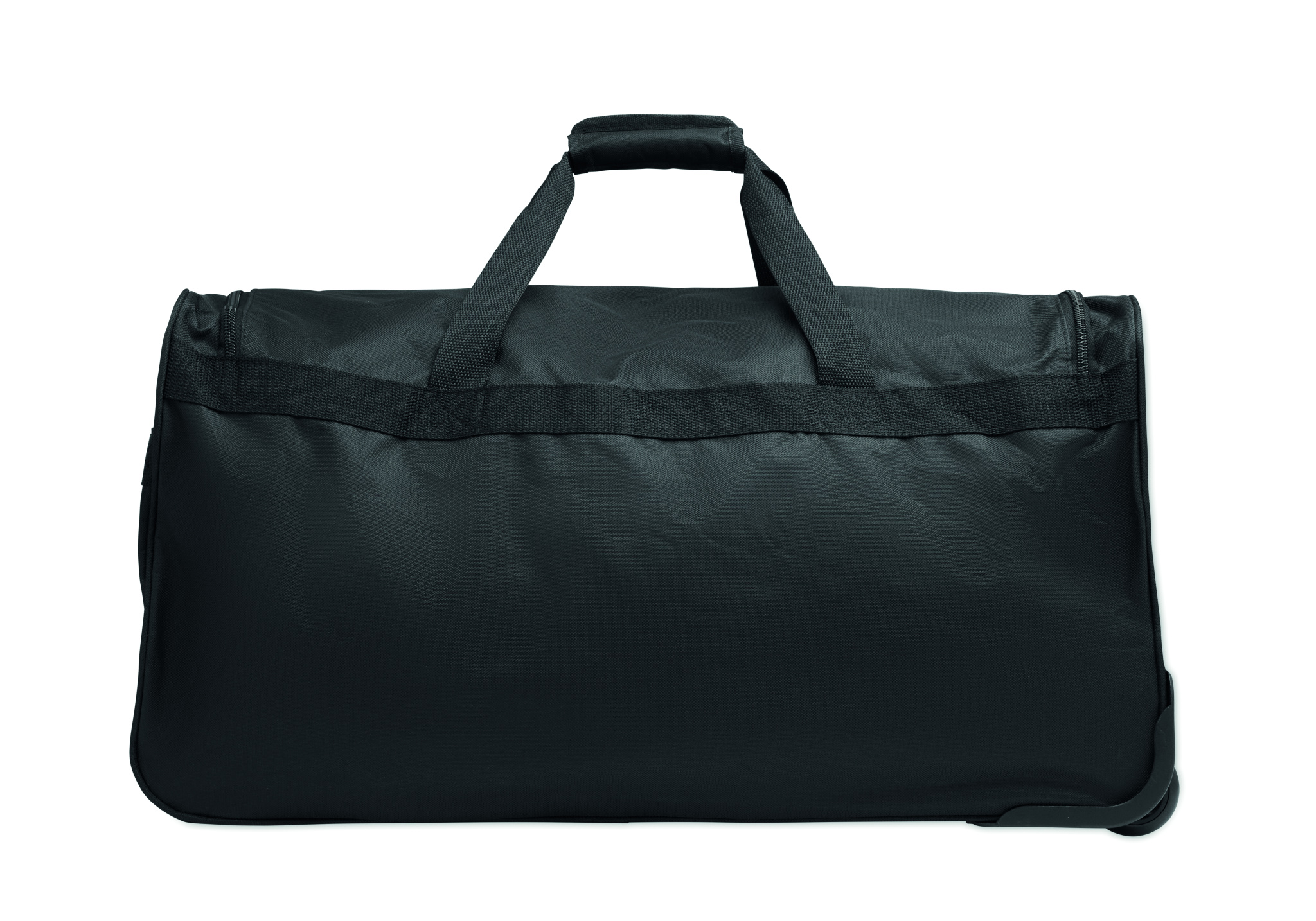 Soft duffle bag trolley in 600D RPET. Zippered front pocket. Two side slip pockets. Three inner pockets. Padded shoulder straps. 2 wheels and double tube frame.