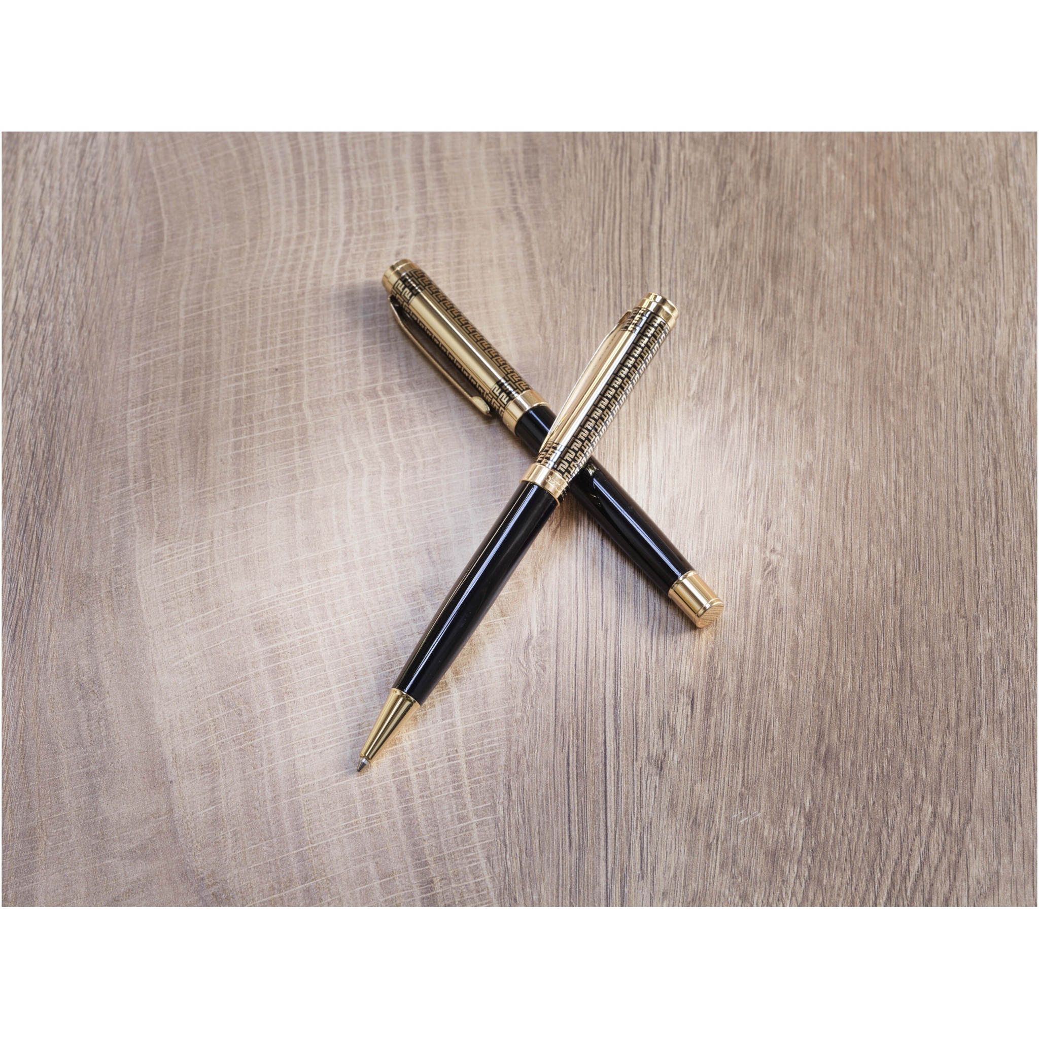 Набор ручек Legato представляет собой элегантное сочетание шариковой ручки и ручки-роллера. Обе ручки имеют верхний корпус из переработанной латуни с золотой хромированной отделкой, нижний корпус с черным напылением, аксессуары из металлического золота с хромированием, логотип LUXE на среднем кольце и синие чернила. Шариковая ручка имеет длину письма 800 метров и размер пера 1,00 мм. Ручка-роллер имеет длину письма 400 метров и размер пера 0,7 мм.