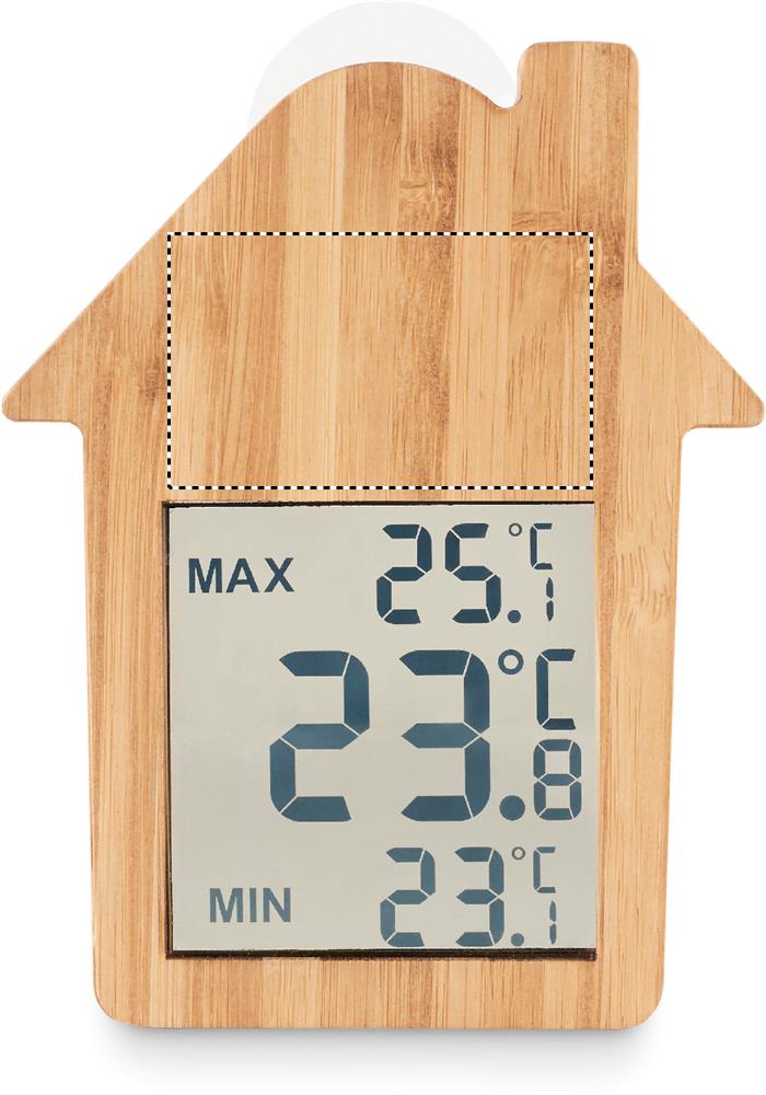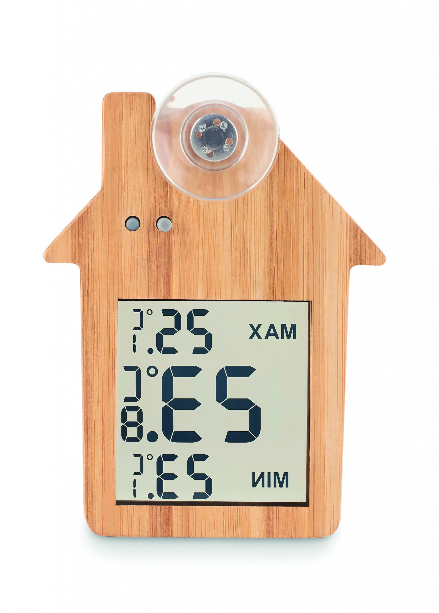 Бамбуковая метеостанция в форме домика с присоской на задней стороне. В комплекте 1 батарейка LR44.