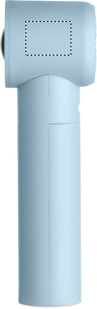 Mini handheld fan in ABS with screen display and 5 speed settings. Includes replaceable 2600mAh rechargeable lithium battery.