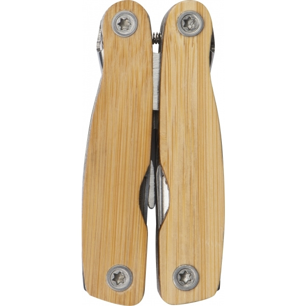 Многофункциональный инструмент из нержавеющей стали с бамбуковыми ракушками и различными инструментами, такими как плоскогубцы, нож, пила, отвертка, напильник и т. д. Ваш логотип будет выгравирован на одной стороне ручки.