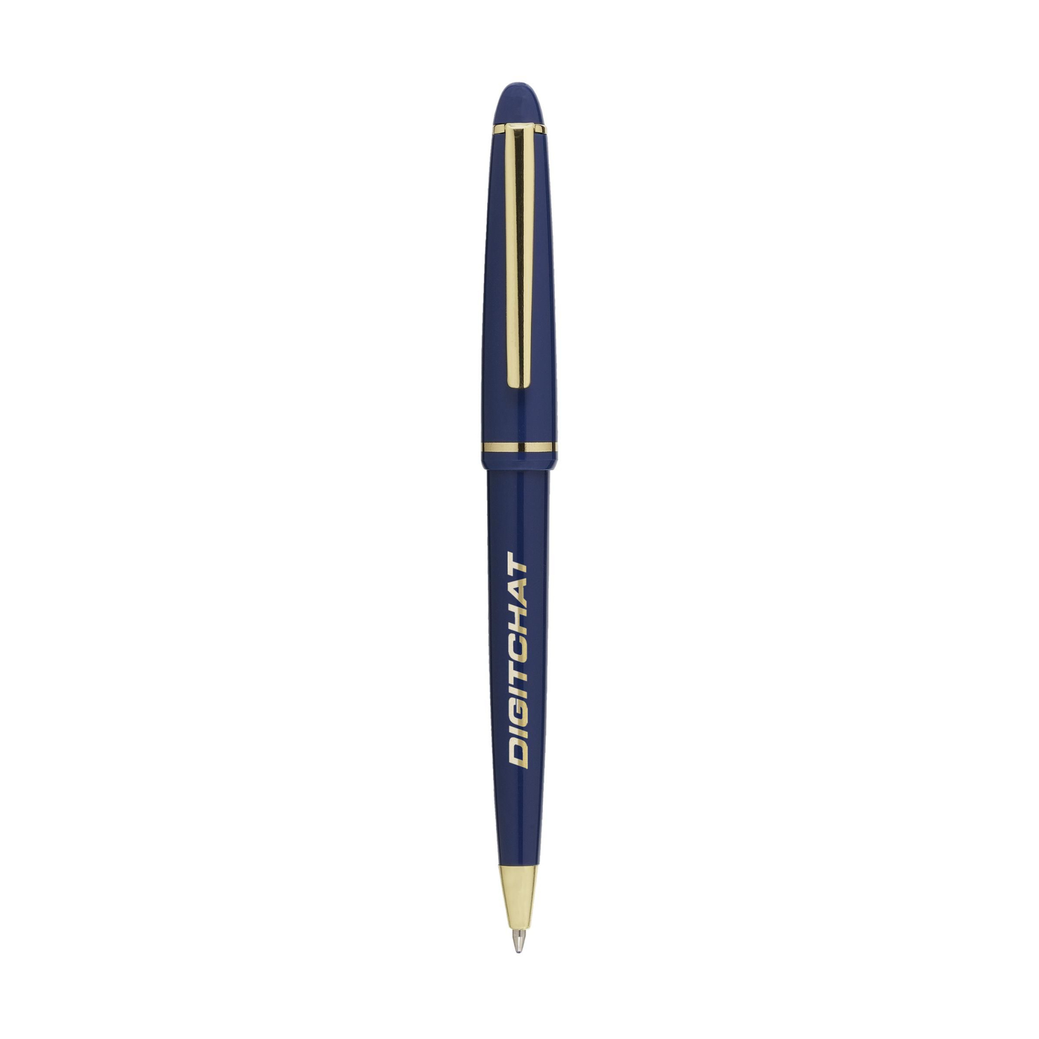 Шариковая ручка с синими чернилами, полированным корпусом, позолоченным, богато украшенным клипом и поворотным наконечником.