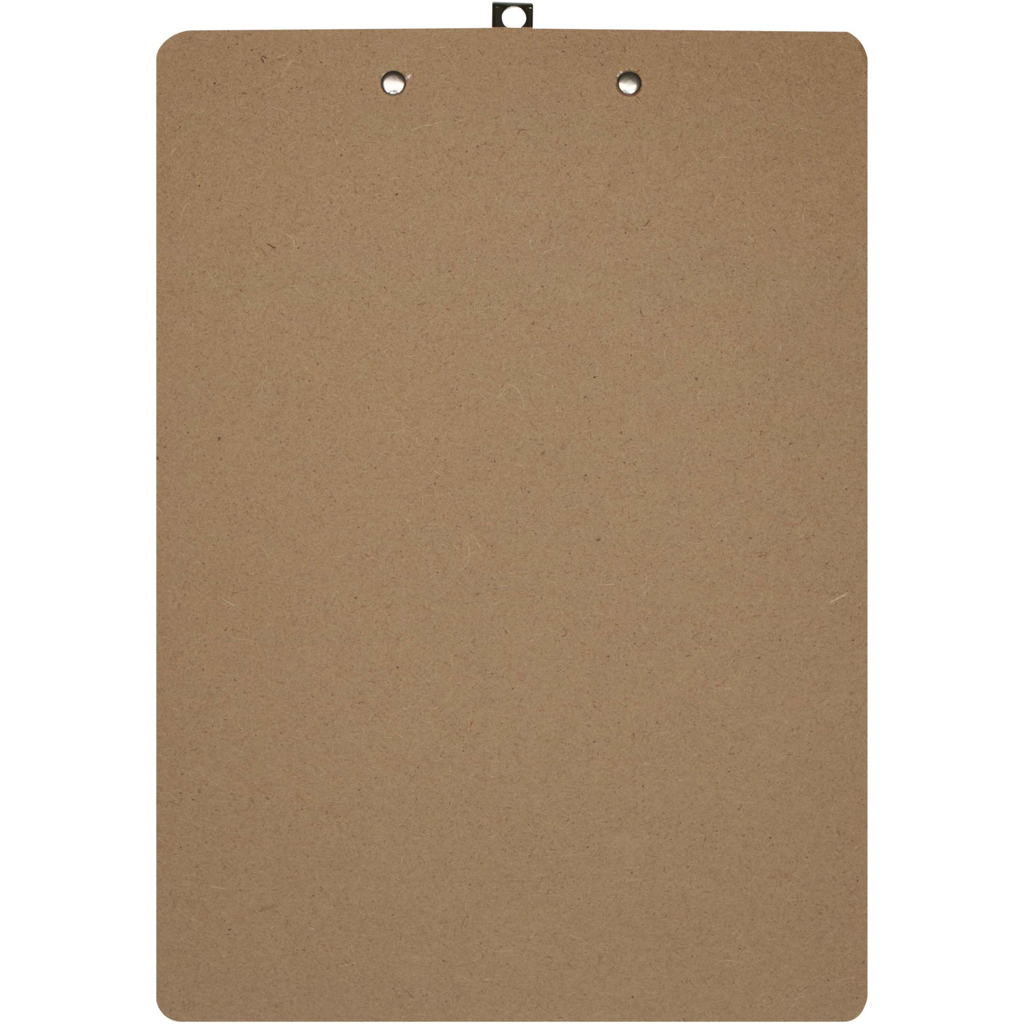 Удобный планшет из МДФ (древесноволокнистая плита средней плотности). Зажим, удерживающий лист бумаги, изготовлен из железа и пластика PP. Размер: 32 x 23 x 0,24 см.
