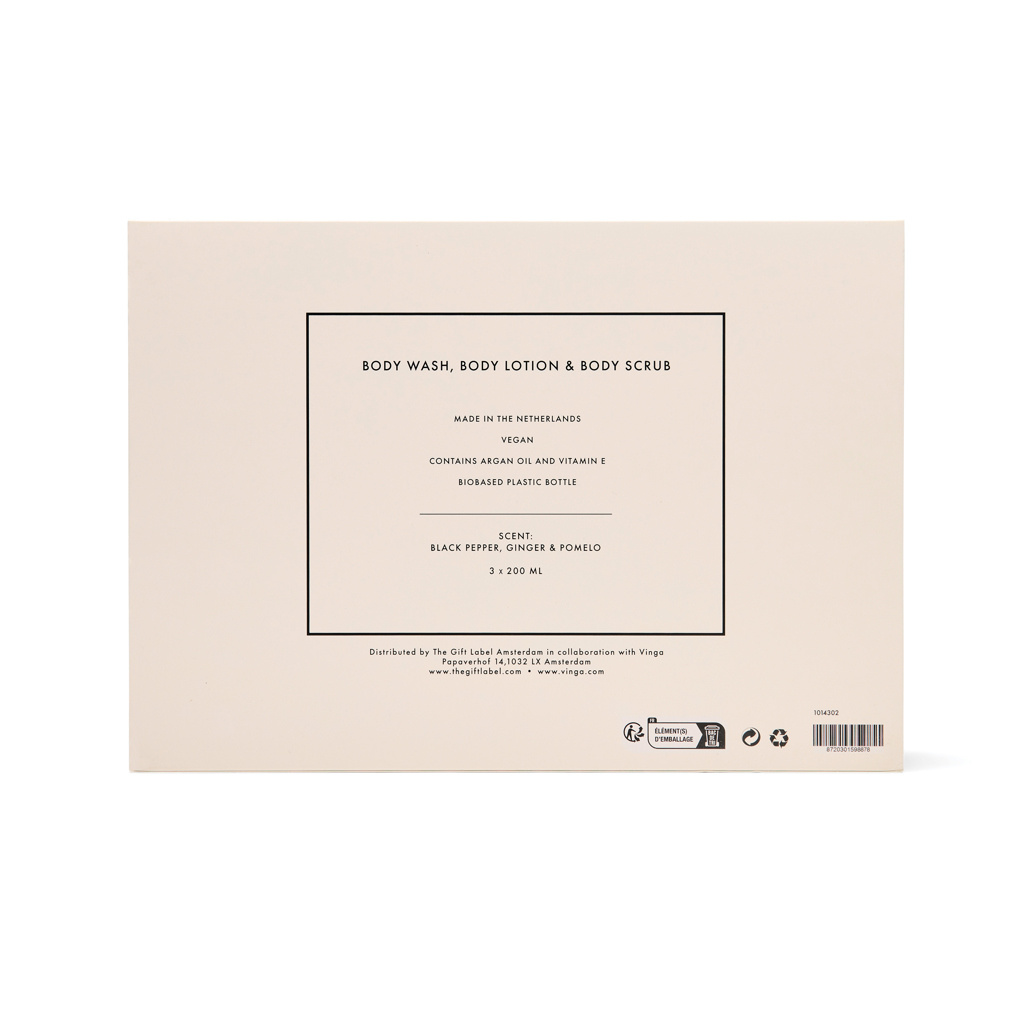 Превратим каждый душ или ванну в роскошный ритуал. Этот набор из 3 предметов включает тюбики по 200 мл геля для душа, скраба для тела и лосьона для тела, созданных для питания вашей кожи от головы до пят. Насыщенный теплым, бодрящим ароматом черного перца, имбиря и помело, он делает вашу кожу гладкой, свежей и придает ей тонкий аромат. Элегантная подарочная коробка кремово-белого и черного цвета.