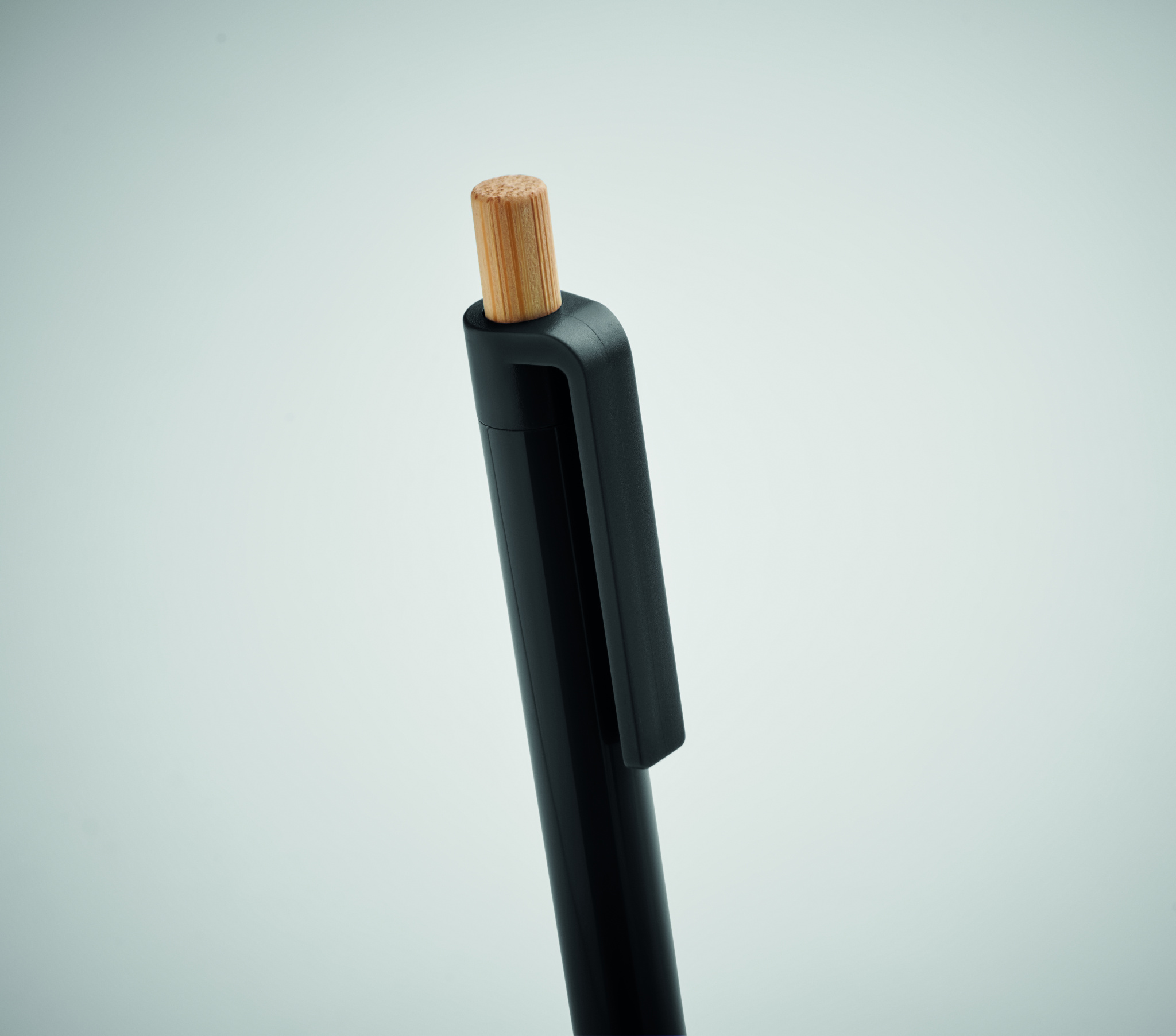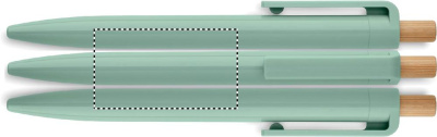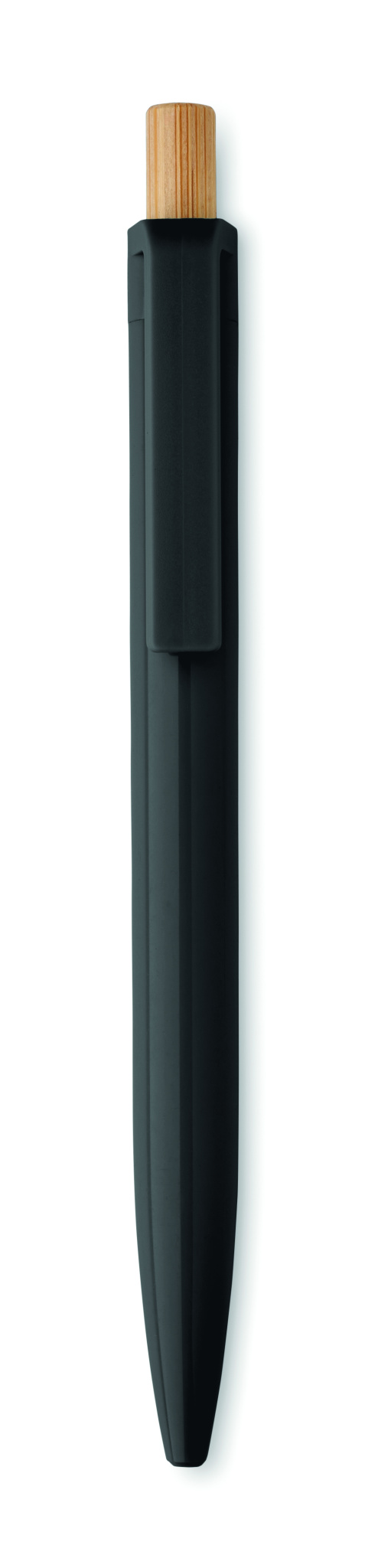Ball pen in recycled ABS with bamboo push button. Blue ink.