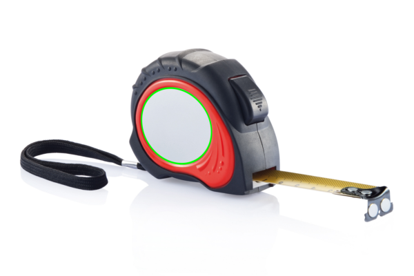 Рулетка, красный корпус из АБС-пластика с черной резиновой ручкой, черный зажим для ремня, черная кнопка остановки, черный концевой крючок с 2 сильными магнитами, желтая лента, матовая серебристая наклейка из ПВХ на корпусе.