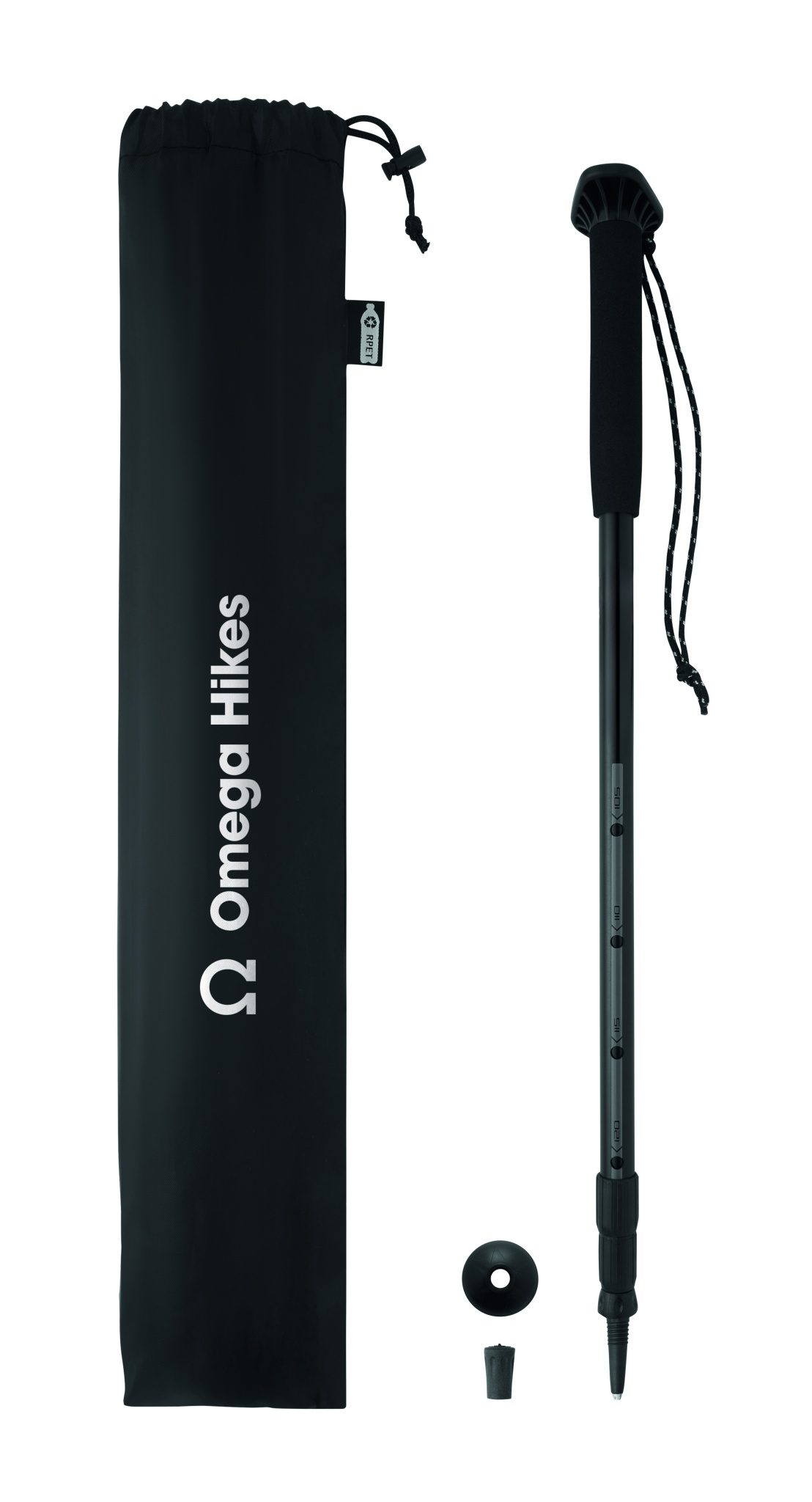 Telescopic walking pole with EVA handle, wrist strap, rubber tip, and mud basket. Adjustable from 105 to 120 cm. Packed in RPET drawstring pouch. Lightweight and durable design.