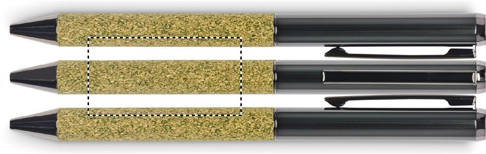 Twist metal ballpen with fabric on barrel made of 20% tea grounds, 30% cork, 50% polycotton cloth in carton box. Blue ink.