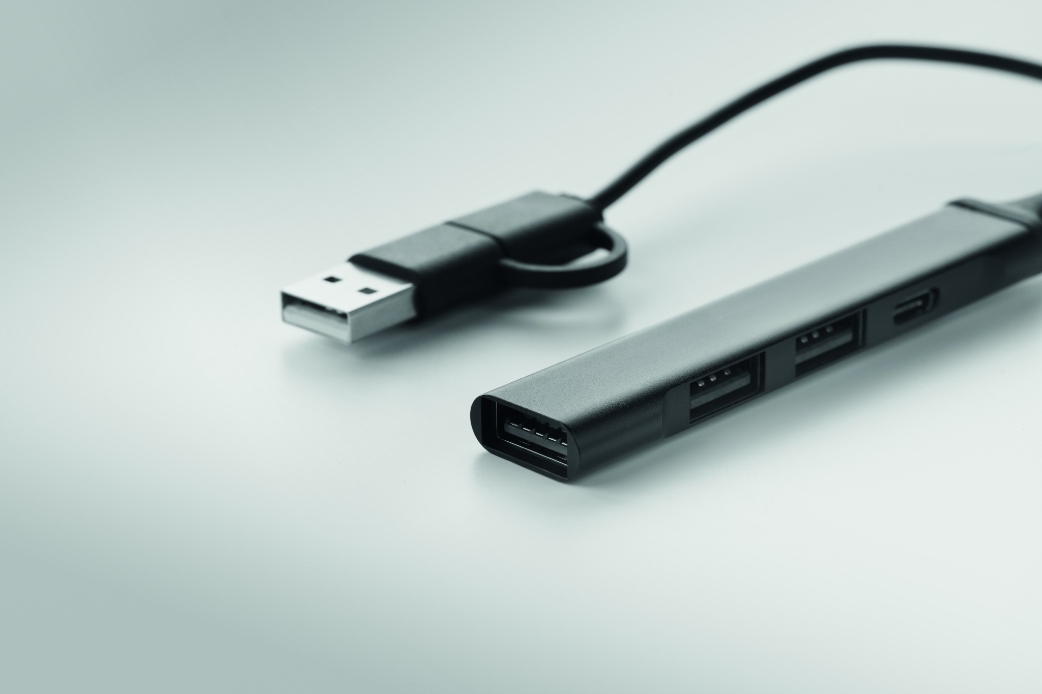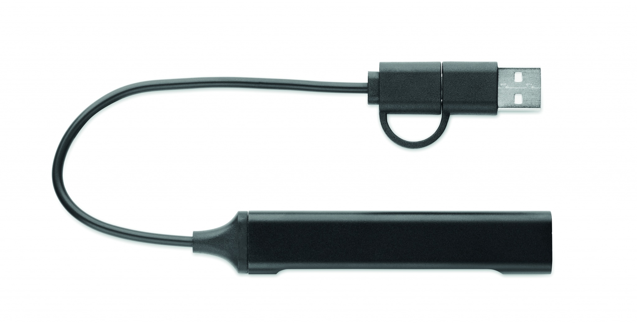 USB разветвитель на 4 порта из переработанного алюминия. 3 USB-A + 1 Type-C. Вход: 2-в-1 Type-C и Type-A. Длина кабеля: 19 см.