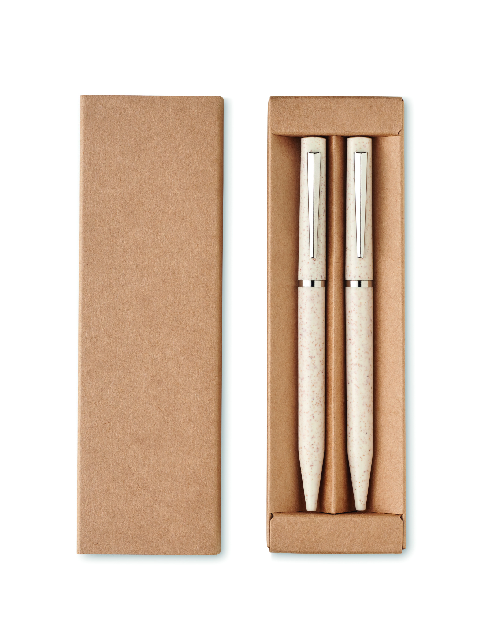 Wheat straw/ABS pen set with 1 twist ball pen blue ink and 1 twist graphite inkless ball pen. Presented in recycled paper box.