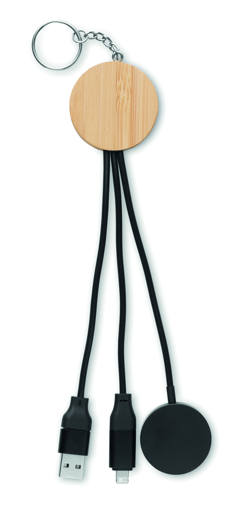 Nyckelring 4 i 1 laddningskabel 60W med bambu detalj. Ingång: 2-i-1 Typ-C & amp; Typ-A. Utgång: Laddning av klockor (Samsung® och Apple®) , typ-C och micro-B (2 i 1 stift). (ej dataöverföring)