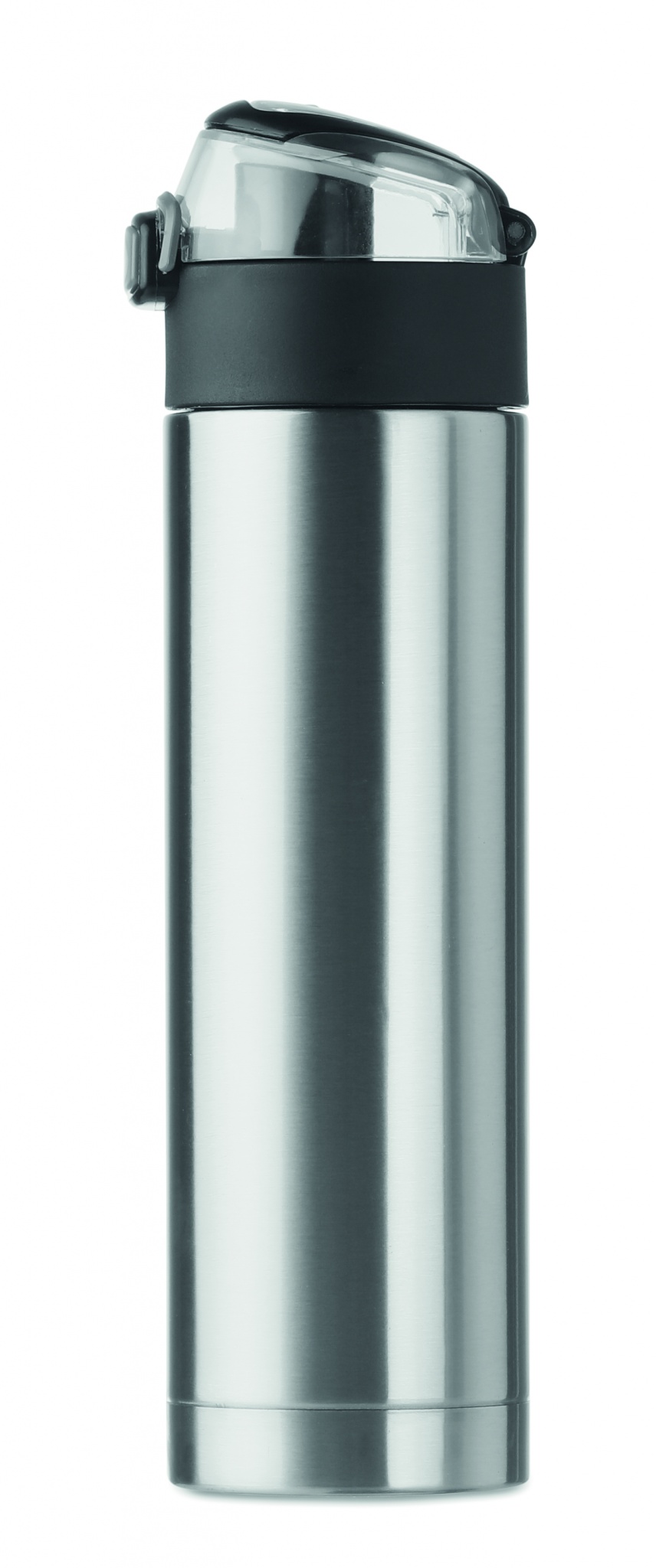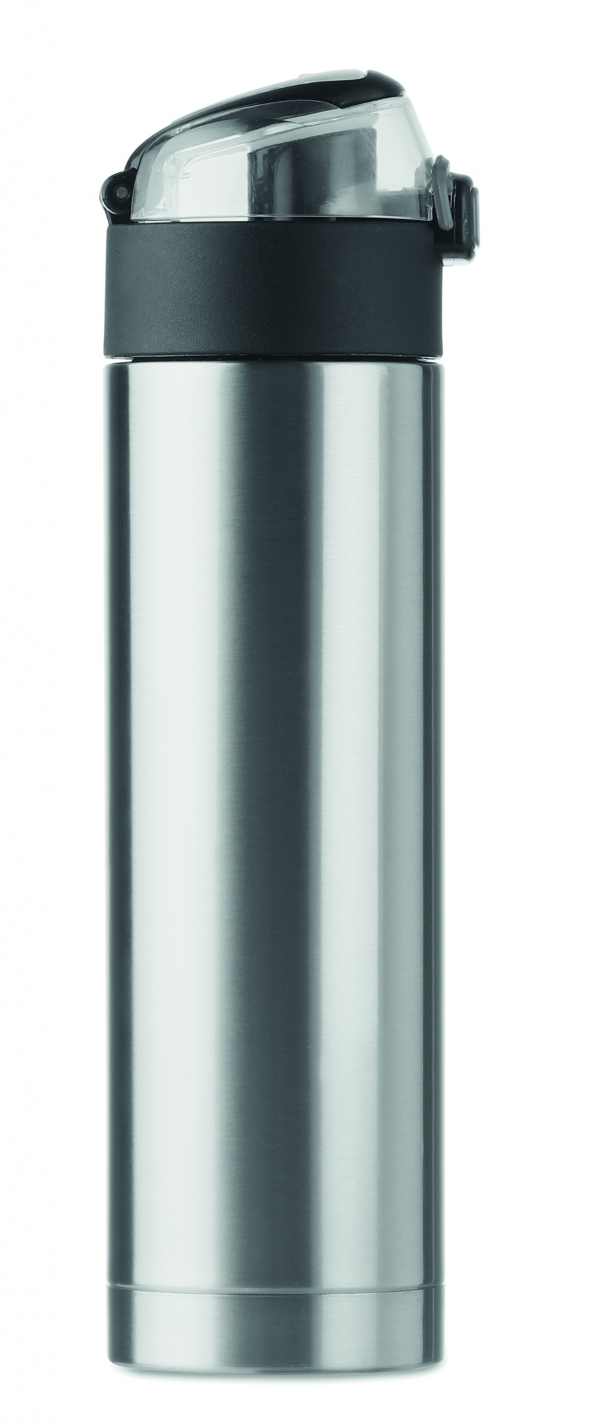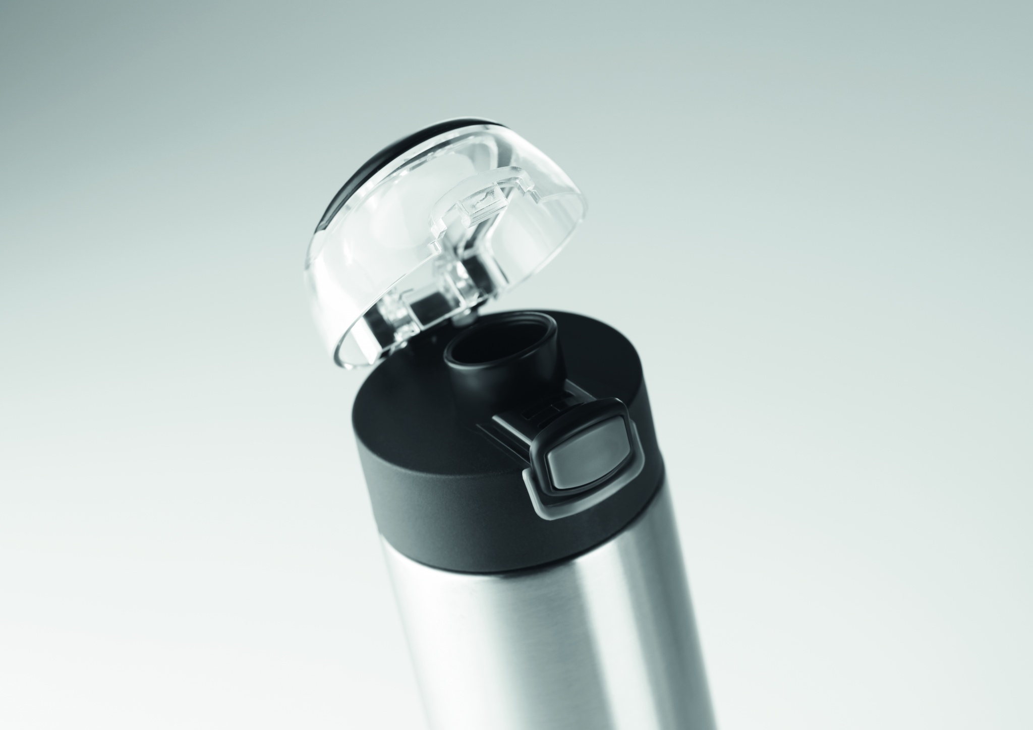 Dricksflaska med isolerande dubbelvägg i rostfritt stål och läckagefritt förslutningslock. Locket har en extra säkerhetsbygel för att hålla det på plats. Handtaget på toppen kan vikas upp om du praktiskt vill hänga flaskan på något. Vattenflaskan rymmer 400 ml och är 100 % läckagefri. Läckagefritt.