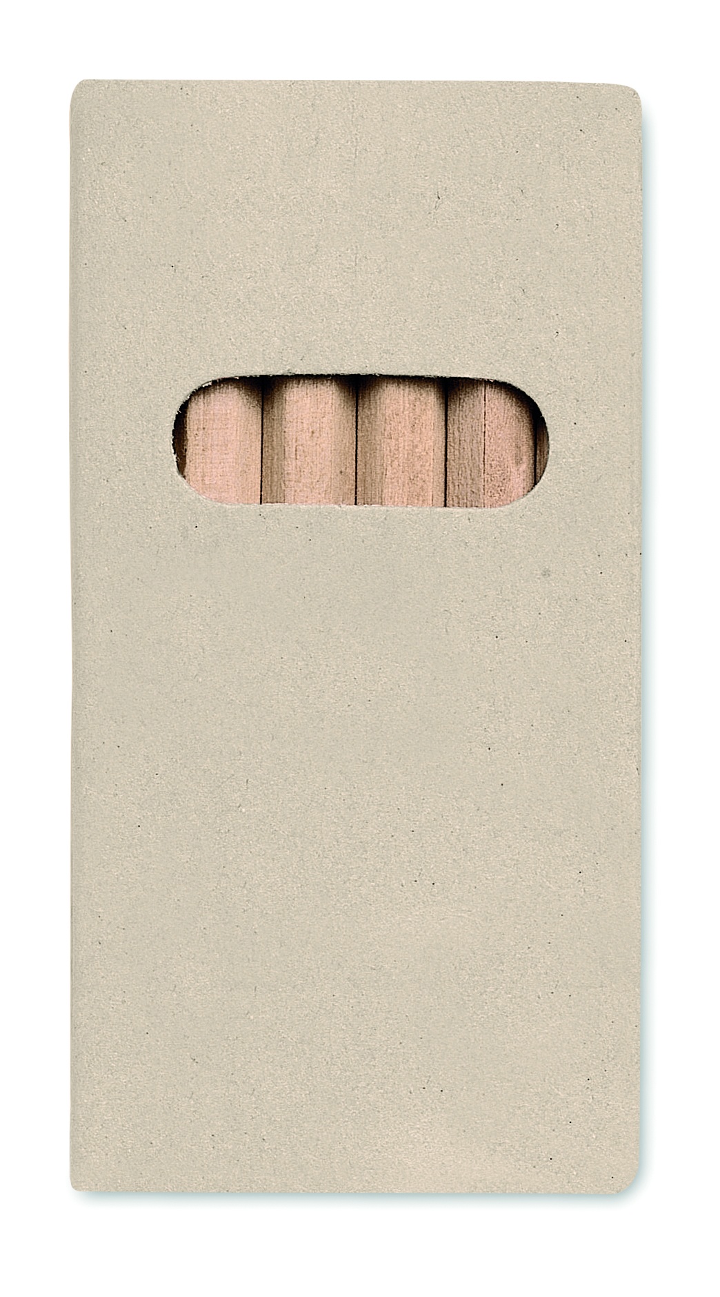 Set med 6 st färgade träpennor i en kartong av obehandlad papp.
