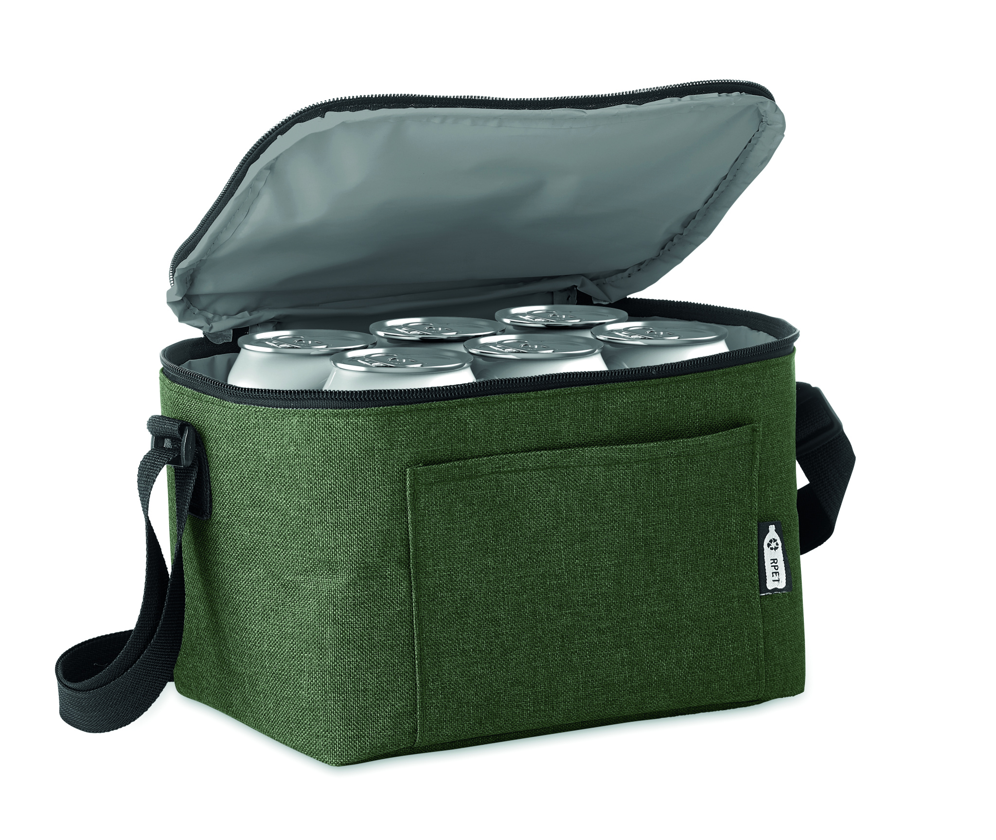 Kylväska för 6st burkar i 2 färgad 600D RPET med frontficka. Isolations material: 0.15mm PEVA + 3mm foam.