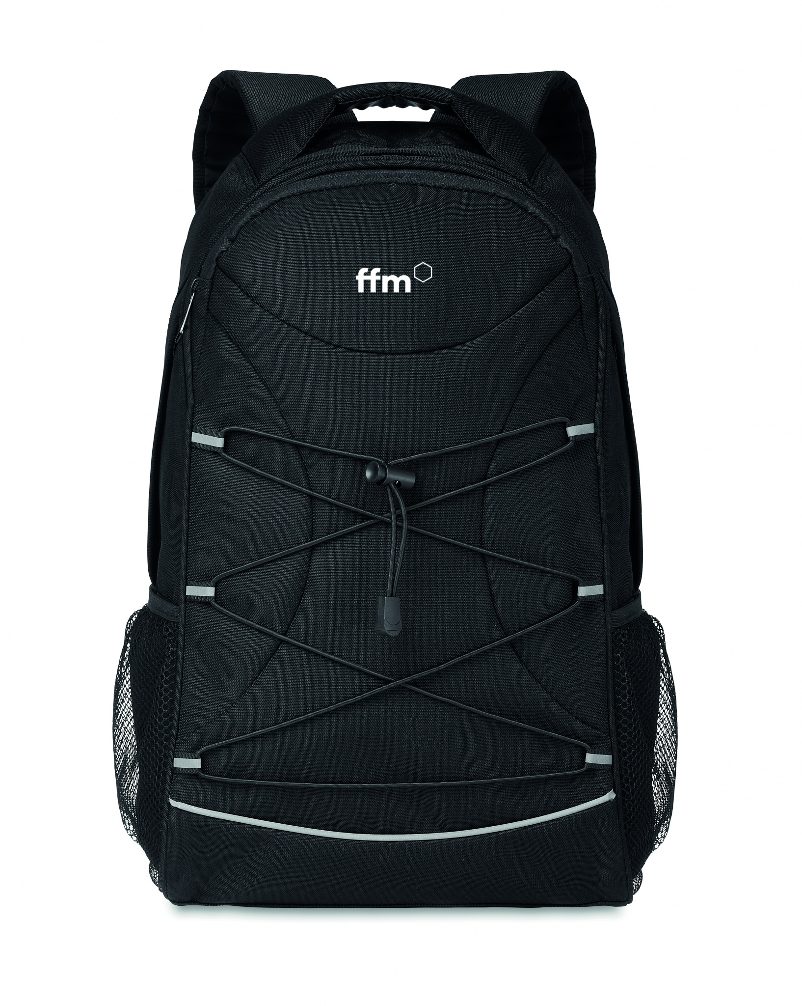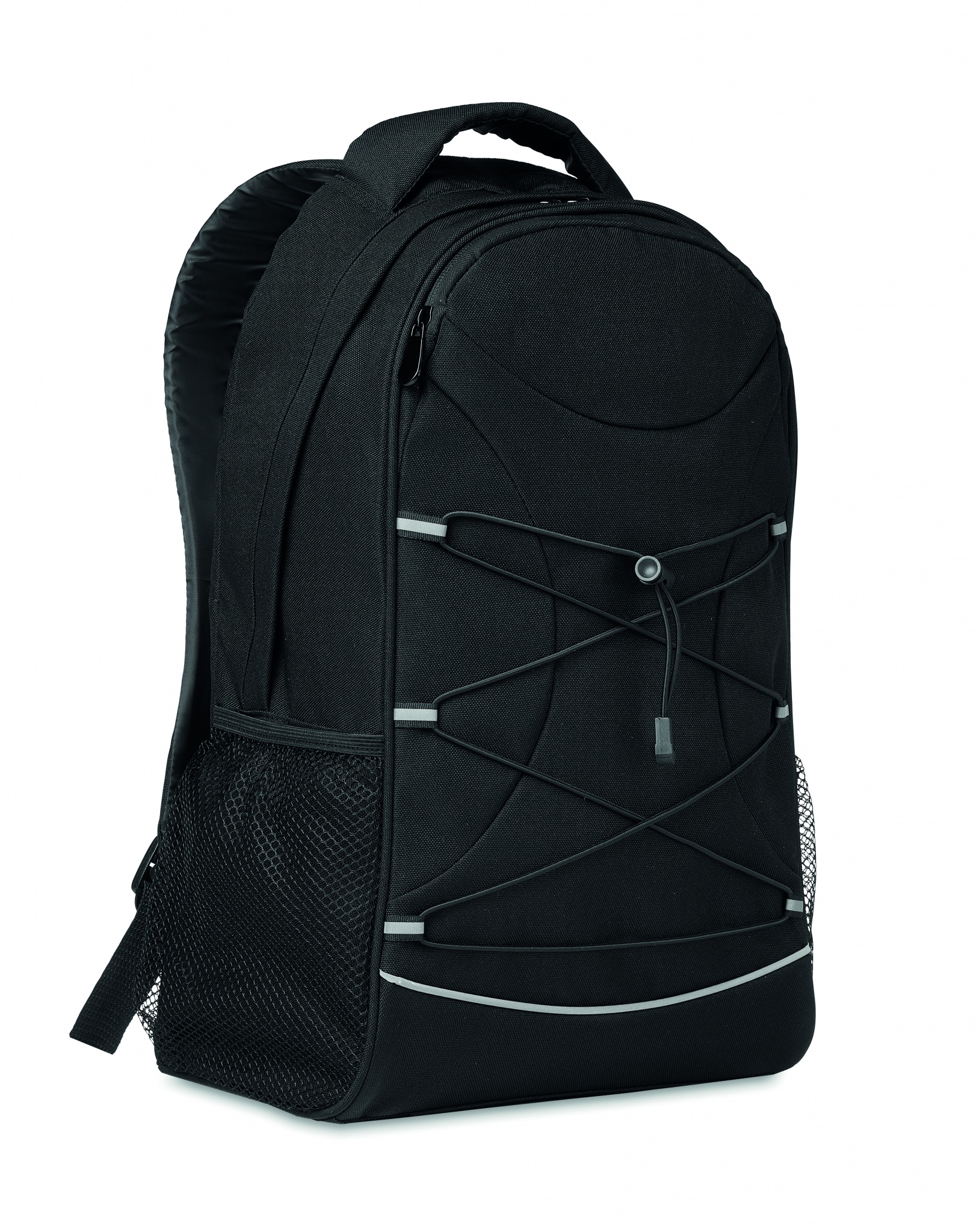 Ryggsäck i 600D RPET med mörka snören fram och reflexdetaljer på framsidan. Meshfickor på båda sidor.