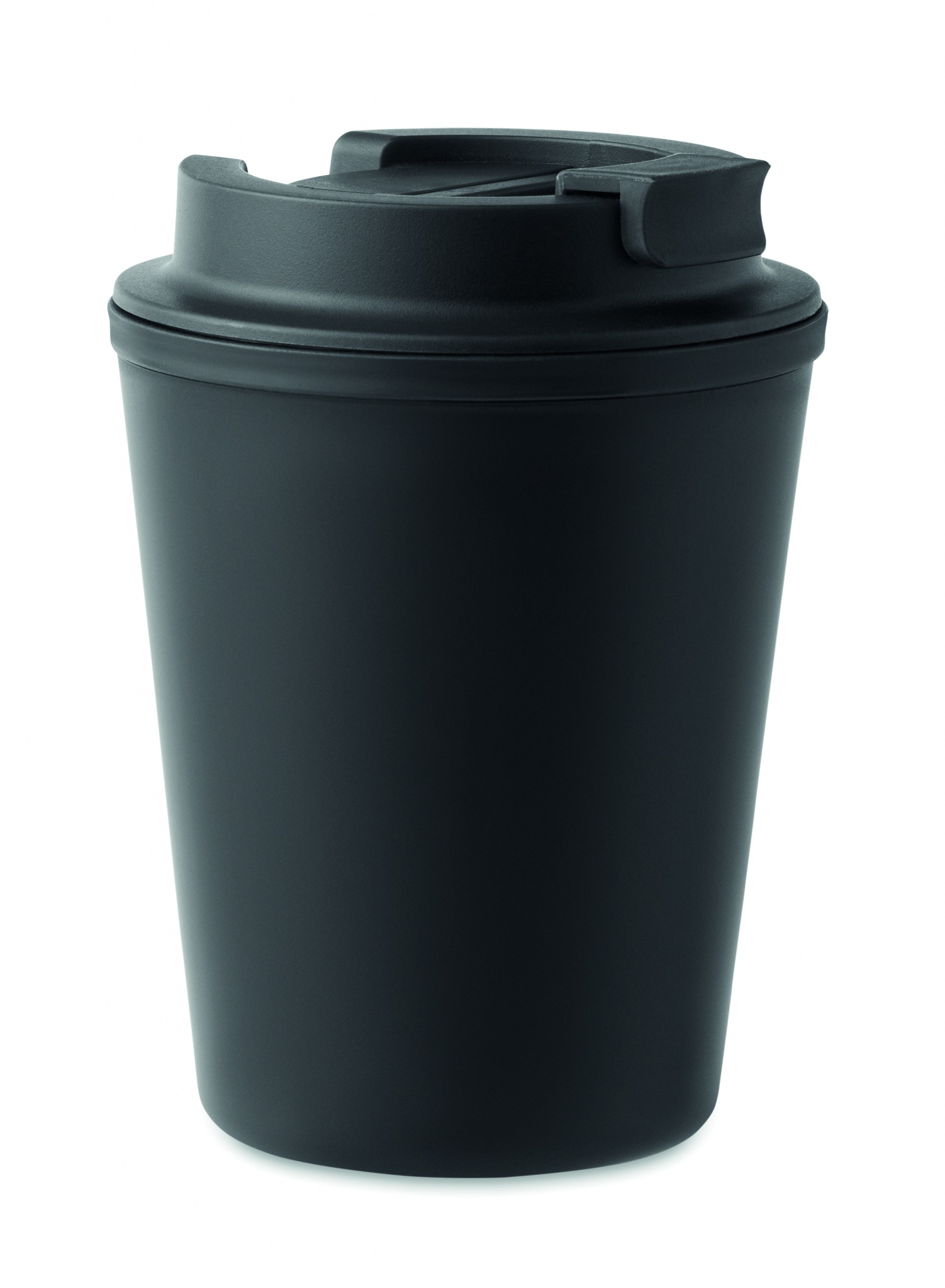Dubbelväggsbägare med lock i återvunnen PP. Volym: 300 ml.