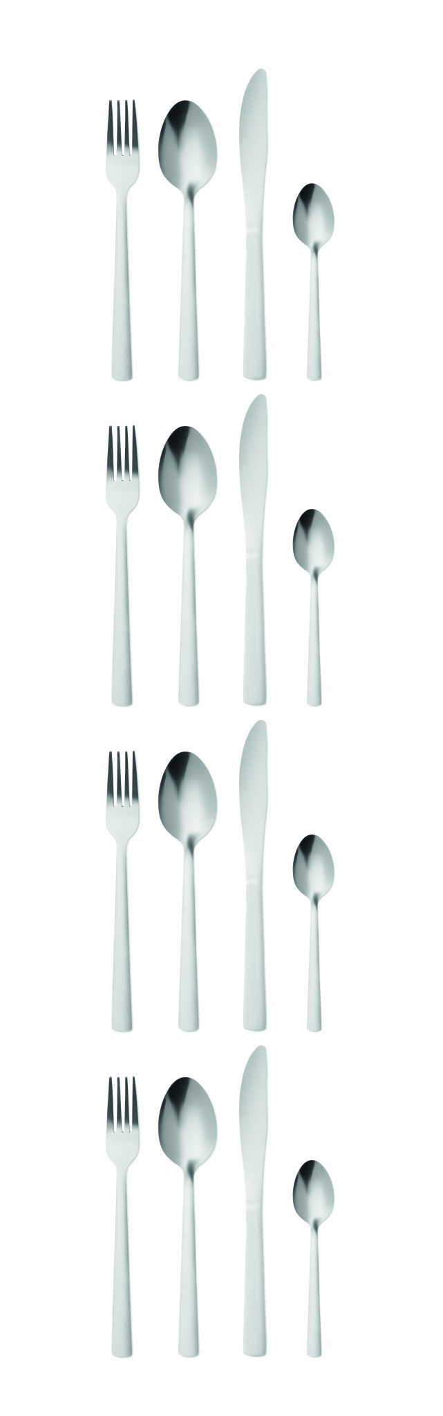 16-delad bestickset i rostfritt stål för 4 dukningar. Innehåller: tesked, bordssked, gaffel, kniv. Presenteras i en kraftpapperslåda.